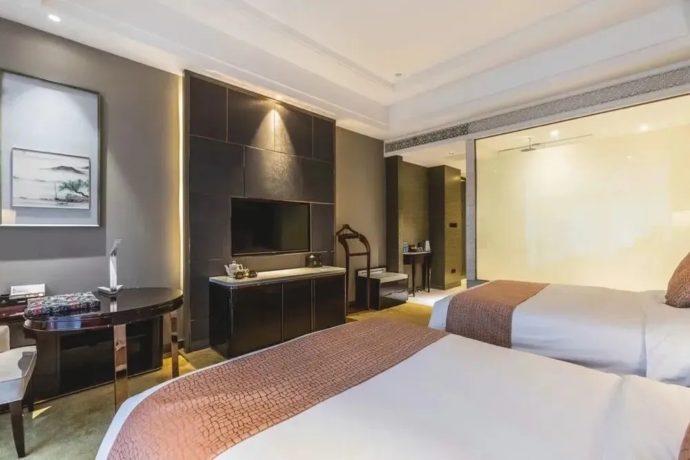 主楼叠翠楼共有227间客房,掩映在莫厘山峰脚下,群山环绕,沉浸式的度假感。45㎡的叠翠楼园景标间,2张双人床1.5米,舒适典雅的客房,房内设计温馨雅致,陈设富丽豪华,坐拥山水美景。