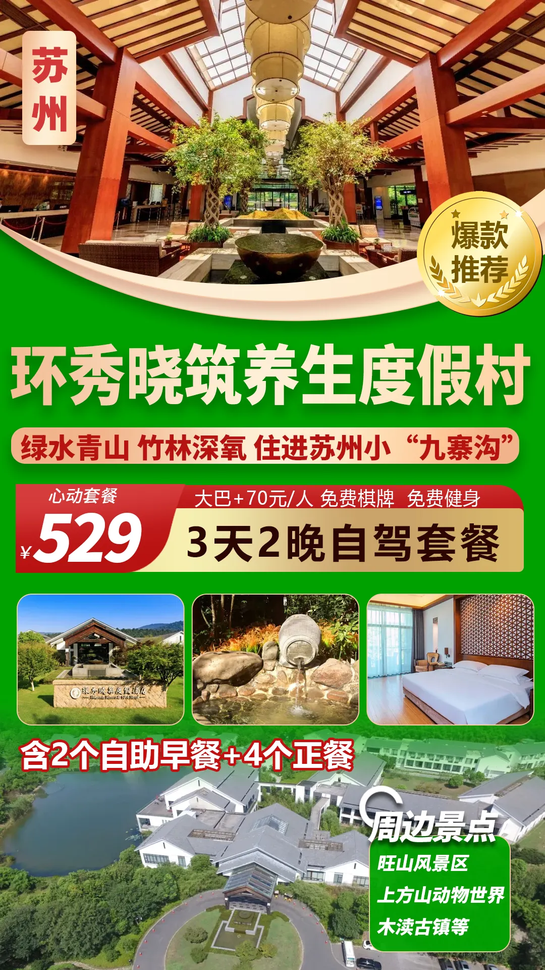 度假村位于南苏州吴中越溪旺山景区,紧临吴中大道,距苏州城区约15分钟车程,距友新高架、环太湖大道以及绕城高速公路入口均约10分钟车程,从上海自驾约1.5小时就能到达。