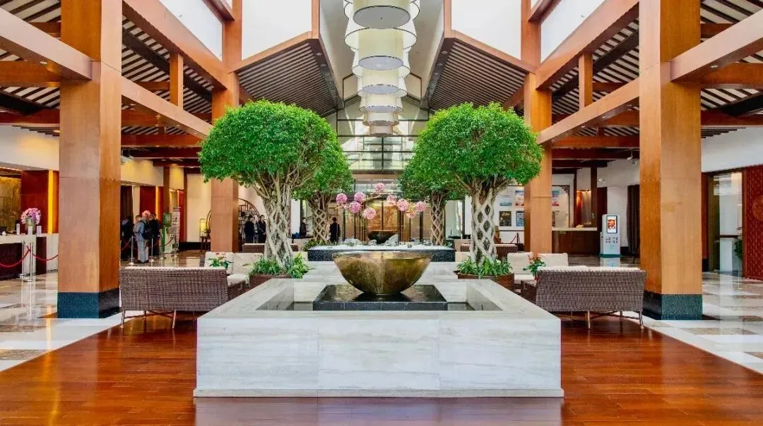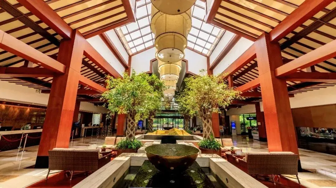 酒店内部装饰是中式古典风格,大堂刚完成全面的硬件升级,到处是木制结构和中式艺术气息,古典大气。