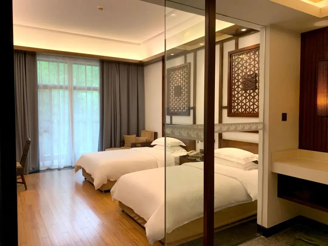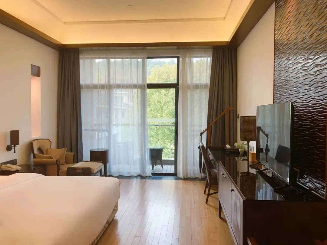酒店竹林环绕,坐拥三面环山、一面临水的空灵山谷风景,花园非常漂亮,有山有水有孔雀,野鸭在湖中悠哉游哉,鸟儿在绿野和竹林间穿梭,有种居住在世外桃源的感觉。