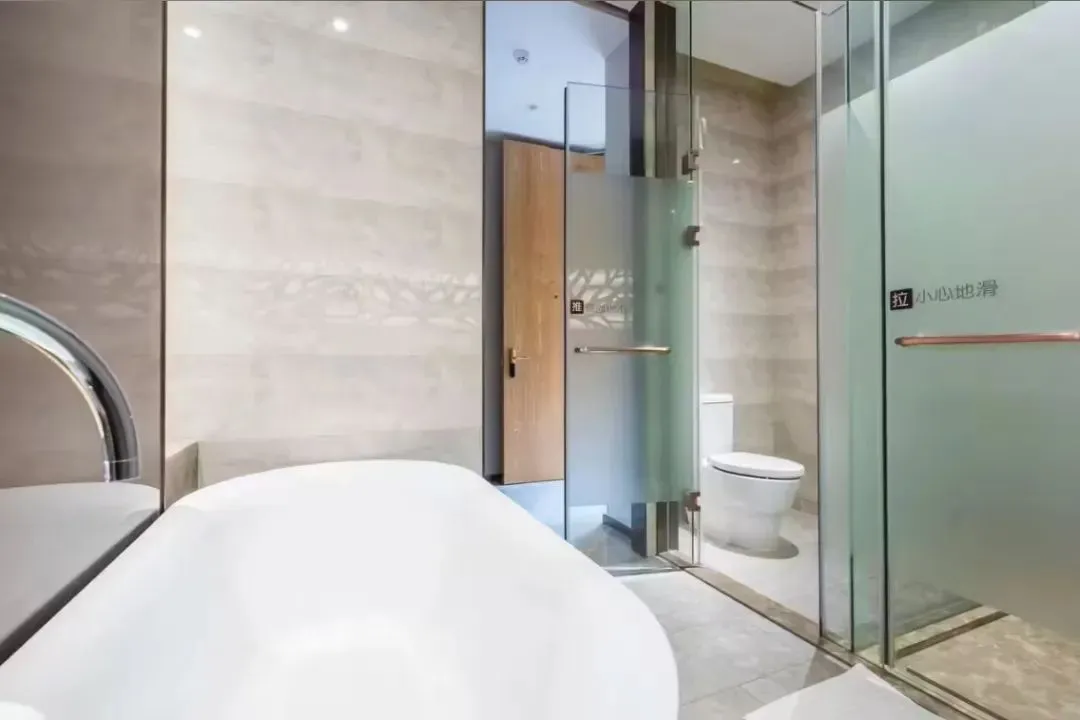 棕褐色古民居窗棂式的菱格木框,将房间隔出了三个区块:睡卧、洗漱沐浴、临窗休憩,三大功能布局,十分人性化。