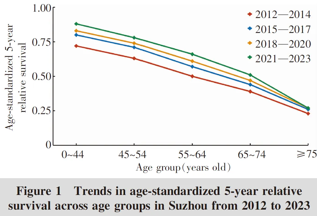 研究显示,0~44岁年龄组为生存率最高群体,2021—2023年标化5年相对生存率达88.3%,75岁及以上老年人群为生存率最低群体,同期标化5年相对生存率仅27.2%,虽较研究初期(23.3%)有所上升,但与0~44岁人群差距仍达61.1个百分点;其余年龄组人群生存率介于两者之间,均随时间稳步上升,但组间差距未明显缩小(Figure 1)。