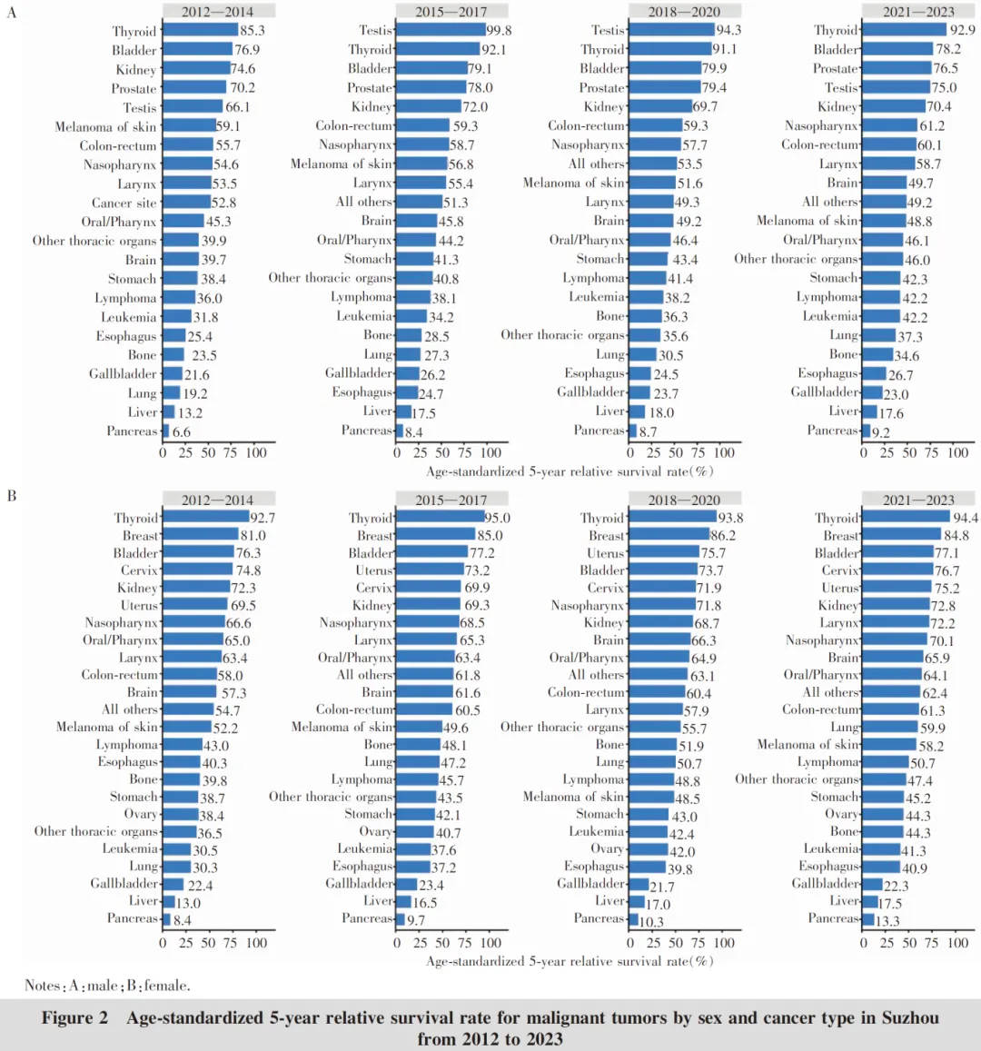 综上所述,苏州市2012—2023年恶性肿瘤5年生存率稳步上升,近年来恶性肿瘤防治工作取得了明显成效,但与经济发达地区相比仍存在显著差距。部分癌种如胰腺癌、肝癌、胆囊癌和食管癌预后较差,男性、老年人群的生存率较低,未来应进一步加强重点人群的肿瘤防治工作。