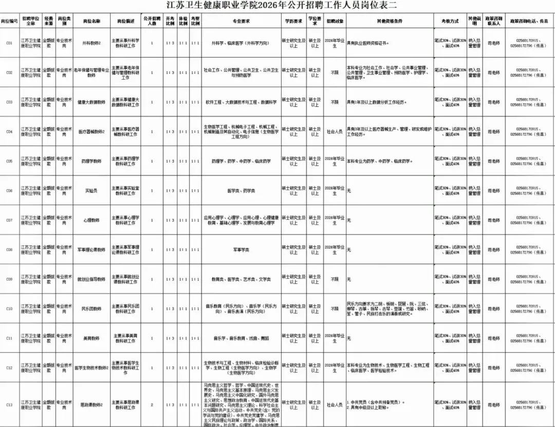 1.江苏卫生健康职业学院2026年公开招聘工作人员岗位表一