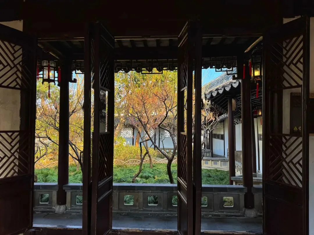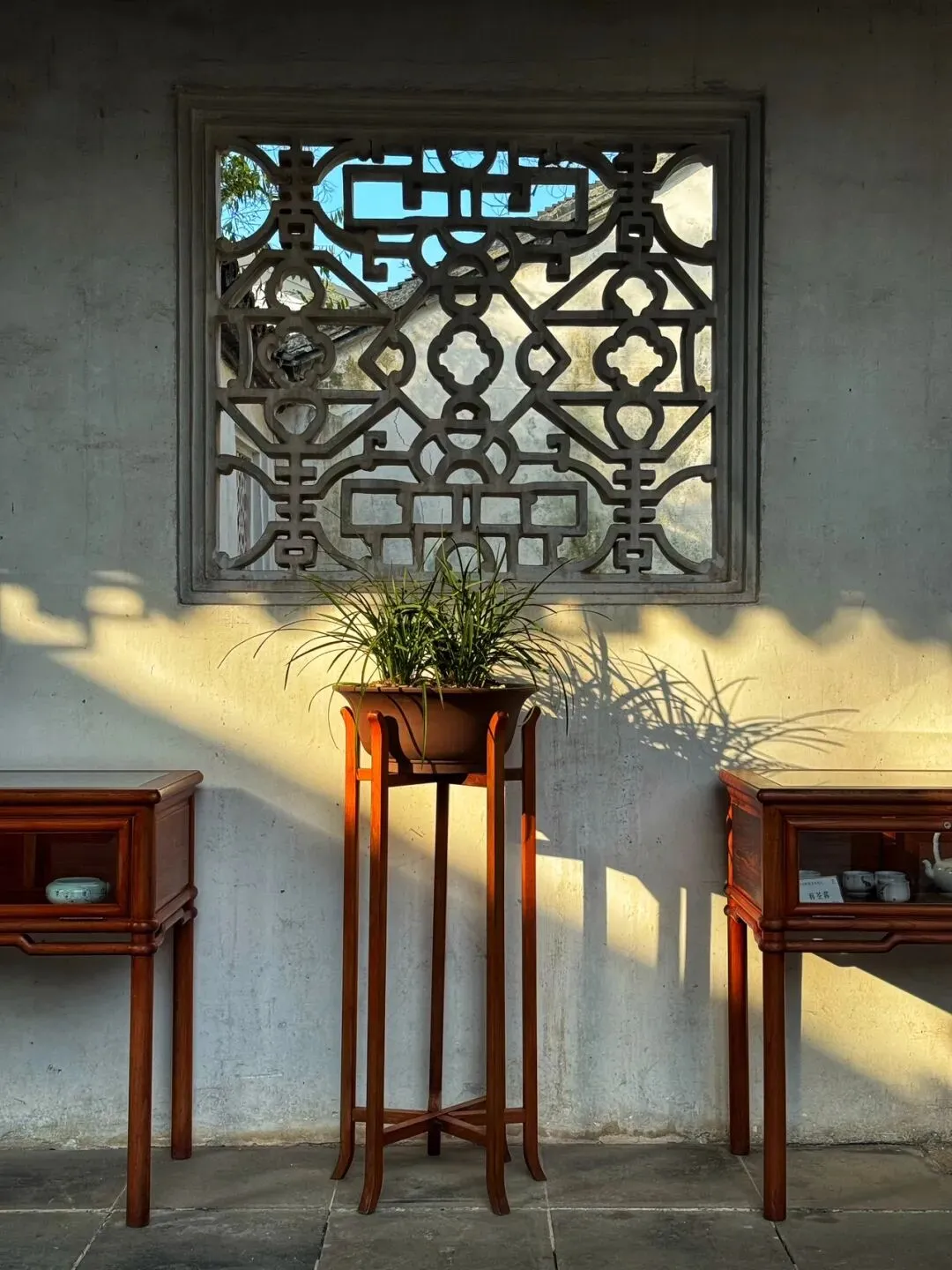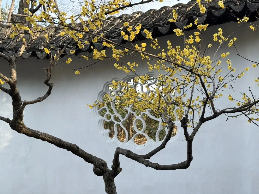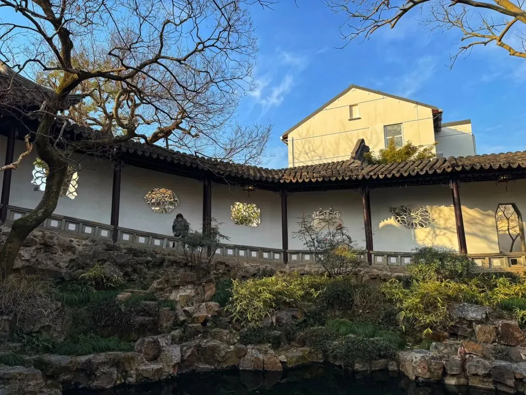沧浪亭的妙处,在于那些玲珑的漏窗。冬日的阳光透过冰裂纹、海棠纹的窗格,将园外的竹影、梅枝裁成一幅幅流动的画,投射在回廊的粉墙上。