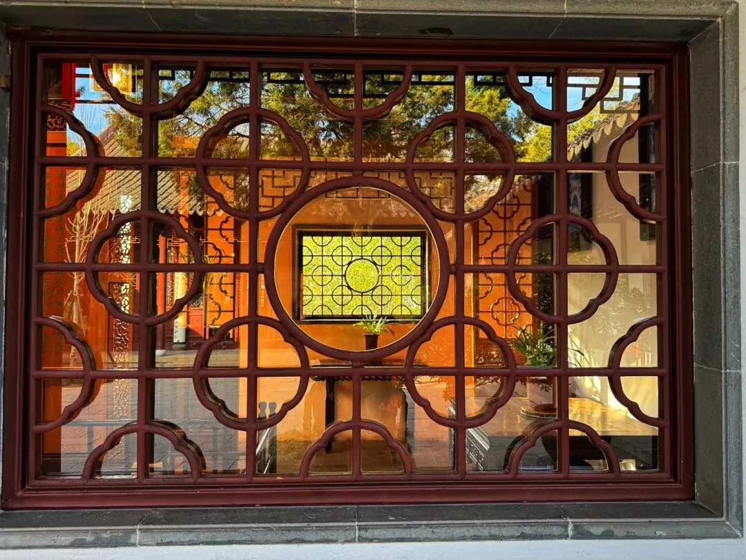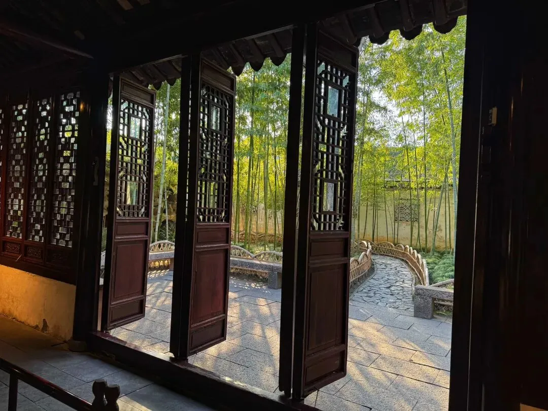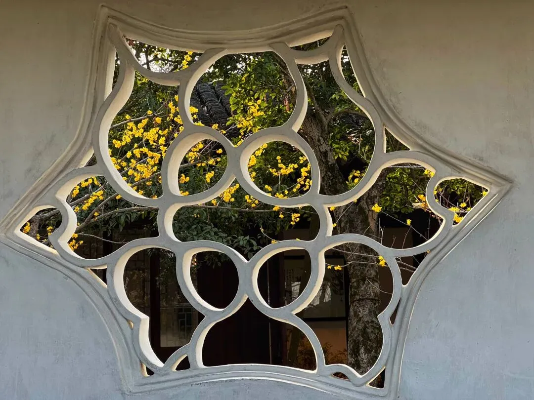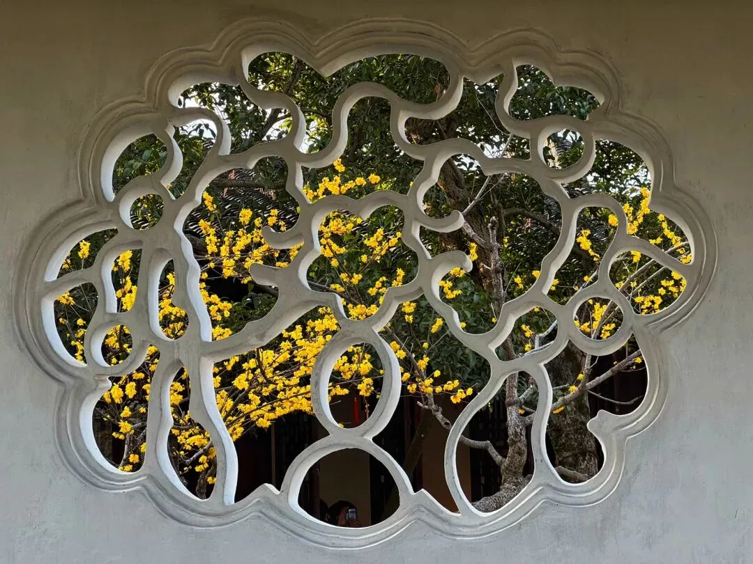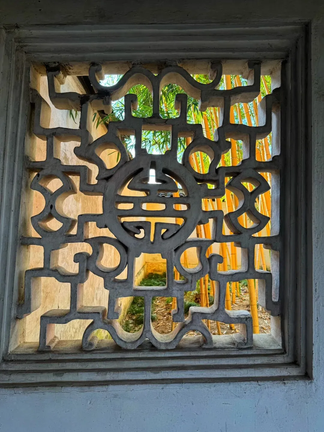 沧浪亭的妙处,在于那些玲珑的漏窗。冬日的阳光透过冰裂纹、海棠纹的窗格,将园外的竹影、梅枝裁成一幅幅流动的画,投射在回廊的粉墙上。