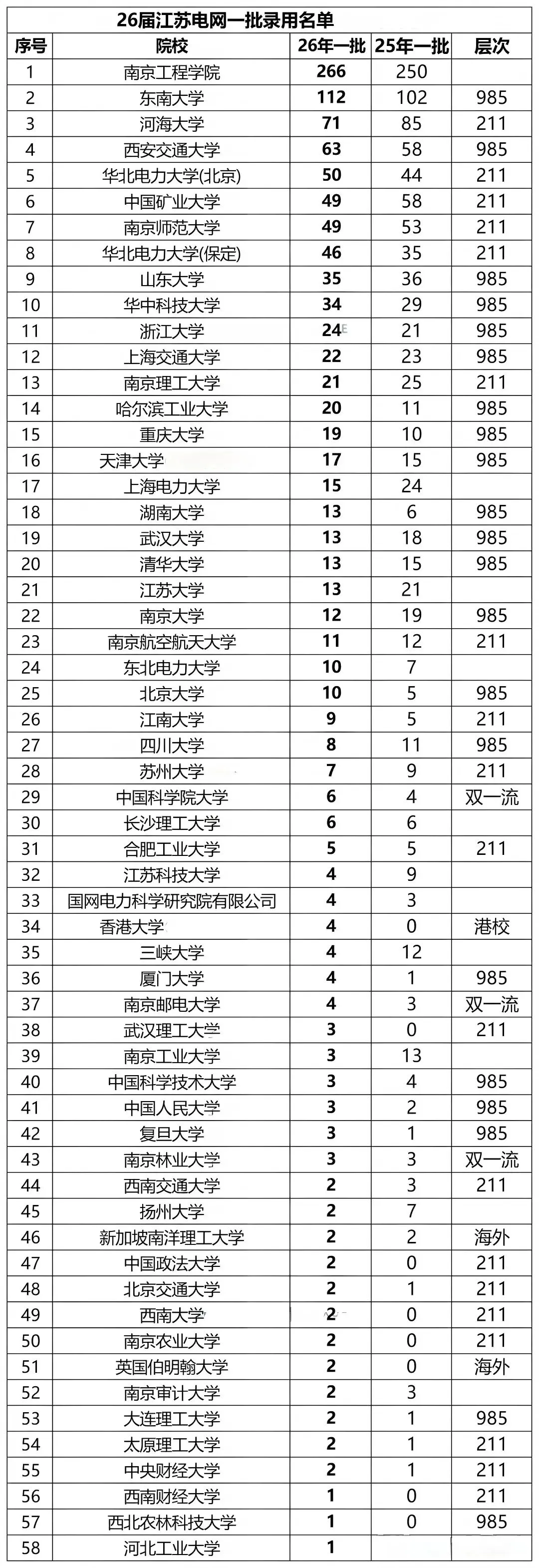 2026 年江苏电网一批录用名单正式公示!本次共录取 1153 人,涵盖国内外多所知名高校,既有本土顶尖学府,也有海外优质院校,录取格局呈现诸多新变化。今天就为大家详细拆解这份录用名单,看看哪些高校备受江苏电网青睐~