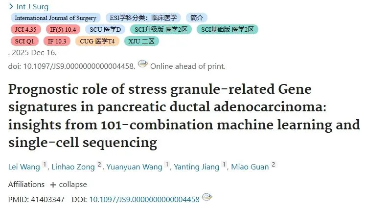 💡南京医科大学这项发表于《International Journal of Surgery》上的首次系统性地揭示了应激颗粒相关基因在胰腺导管腺癌中的多维度预后价值及其在肿瘤微环境中的动态调控网络。