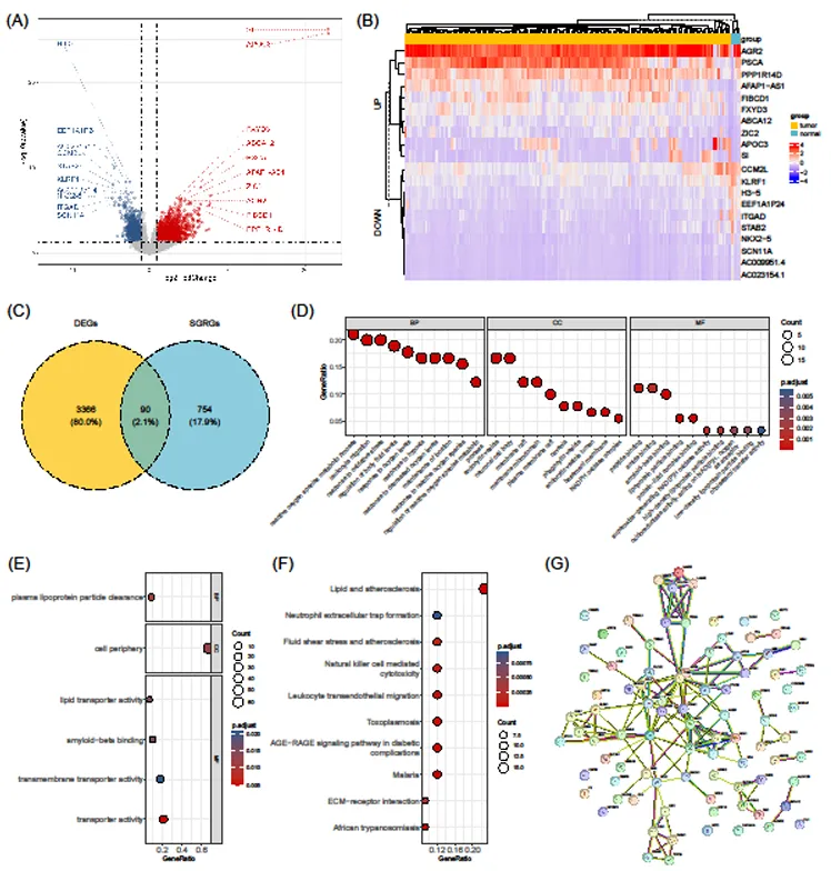 功能富集分析显示,DE-SGRGs 富集于 “活性氧代谢过程”“白细胞迁移” 等生物学过程,以及 “AGER-AGE 信号通路”“ECM - 受体相互作用” 等关键通路,提示其参与 PDAC 的病理进程调控。