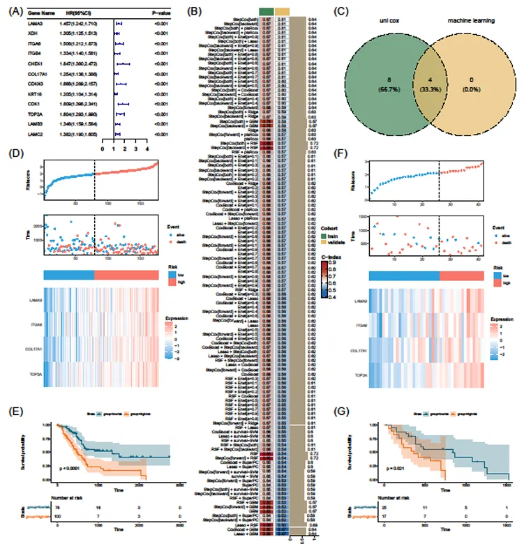 通过单变量 Cox 回归分析和比例风险假设检验,筛选出 12 个候选预后 SGRGs,再结合 10 种机器学习算法的 101 种组合,最终确定 4 个核心预后 SGRGs(LAMA3、ITGA6、COL17A1、TOP2A)