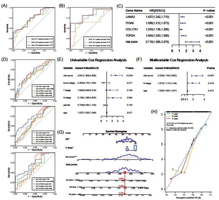 整合风险评分、年龄、N 分期构建诺模图,校准曲线显示预测生存率与实际观察结果高度一致,且风险评分为独立预后因素。