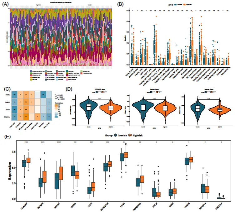 图4:高/低风险组胰腺癌患者中22种免疫细胞的浸润丰度比例图和(B)免疫浸润景观图