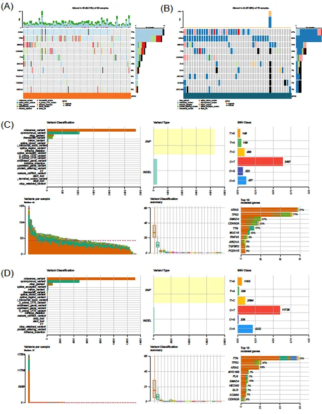 基因突变分析表明,高风险组 KRAS(77%)、TP53(71%)、SMAD4 突变率显著高于低风险组(KRAS 33%、TP53 37%);低风险组基因突变总数更少,单核苷酸多态性(SNP)比例更低,C-T 突变比例更高,提示不同风险组的分子变异模式存在差异。