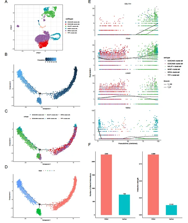 通过伪时间分析探究导管细胞分化与核心基因的关联,用 CellChat 分析细胞间通信。
