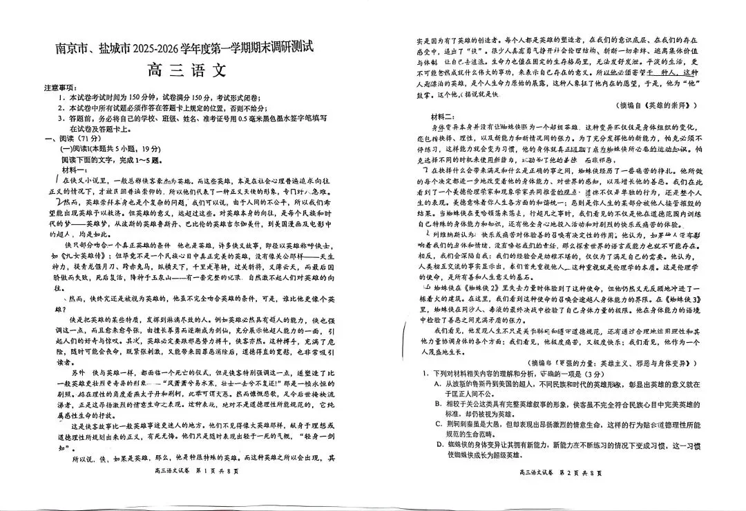 南京、盐城2025-2026第一学期期末调研测试 高三语文