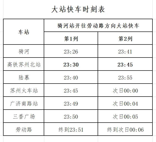 1月26日零时起,全国铁路2026年第一季度新列车运行图正式实施,为保障春运期间旅客出行顺畅,同时做好夜间高铁与地铁的换乘衔接工作,苏州地铁同步优化运营方案,将2号线大站快车苏州北站的末班车发车时间调整至23:45。