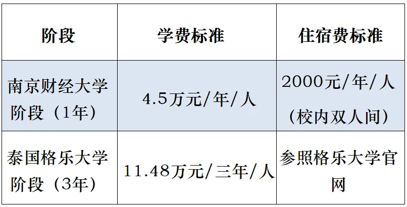 为促进中泰交流,充分发挥双方在教育资源方面的优势,南京财经大学与泰国格乐大学特开设1+3国际本科项目。项目为南京财经大学官方办学,学生在南京财经大学完成1年的课程(含语言课程及专业基础课程等)学习后,前往泰国格乐大学就读,毕业后取得格乐大学的学位证书,该证书可获得中国(教育部)留学服务中心学历学位认证。官方办学:南财自2010年开设国际预科项目,拥有15年丰富的办学经验;资源共享:项目实施精细化管理,学生享受在校统招生同等教育资源;多语言授课:采用中文教学,辅修英语和泰语,提高学生多语言应用能力;认证无忧:所获国外学位均可在中国教育部留学服务中心进行学历学位认证;性价比高:享受原汁原味的英联邦教育体系,留学成本仅为欧美的1/5。3.获取《入学资格确认书》,预缴纳2000元床位预订费(开学时可抵扣住宿费);● 南京财经大学就读阶段学费由南京财经大学官方账号收取,泰国格乐大学就读阶段学费由泰国格乐大学官方账号收取;● 艺术类学费为南京财经大学就读阶段学费4.8万元,泰国格乐大学就读阶段学费13.18万元;● 除简章中列出的学费和住宿费以外,学习期间的生活费、交通费、保险费、实践活动费、入境泰国的签证费、公证费、认证费等可能涉及的额外费用需自理;账号:4301 0112 1910 0159 523电 话:025-83495883;15851803316