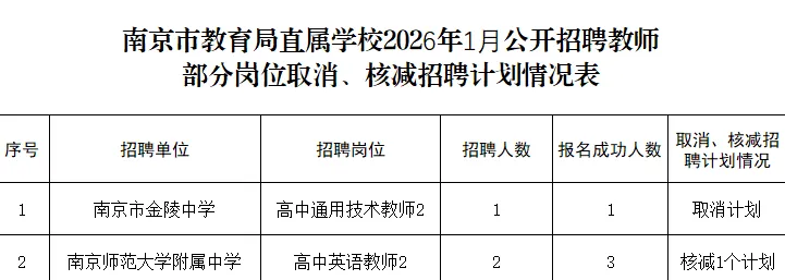 附件:南京市教育局直属学校2026年1月公开招聘教师部分岗位取消、核减岗位招聘计划情况表