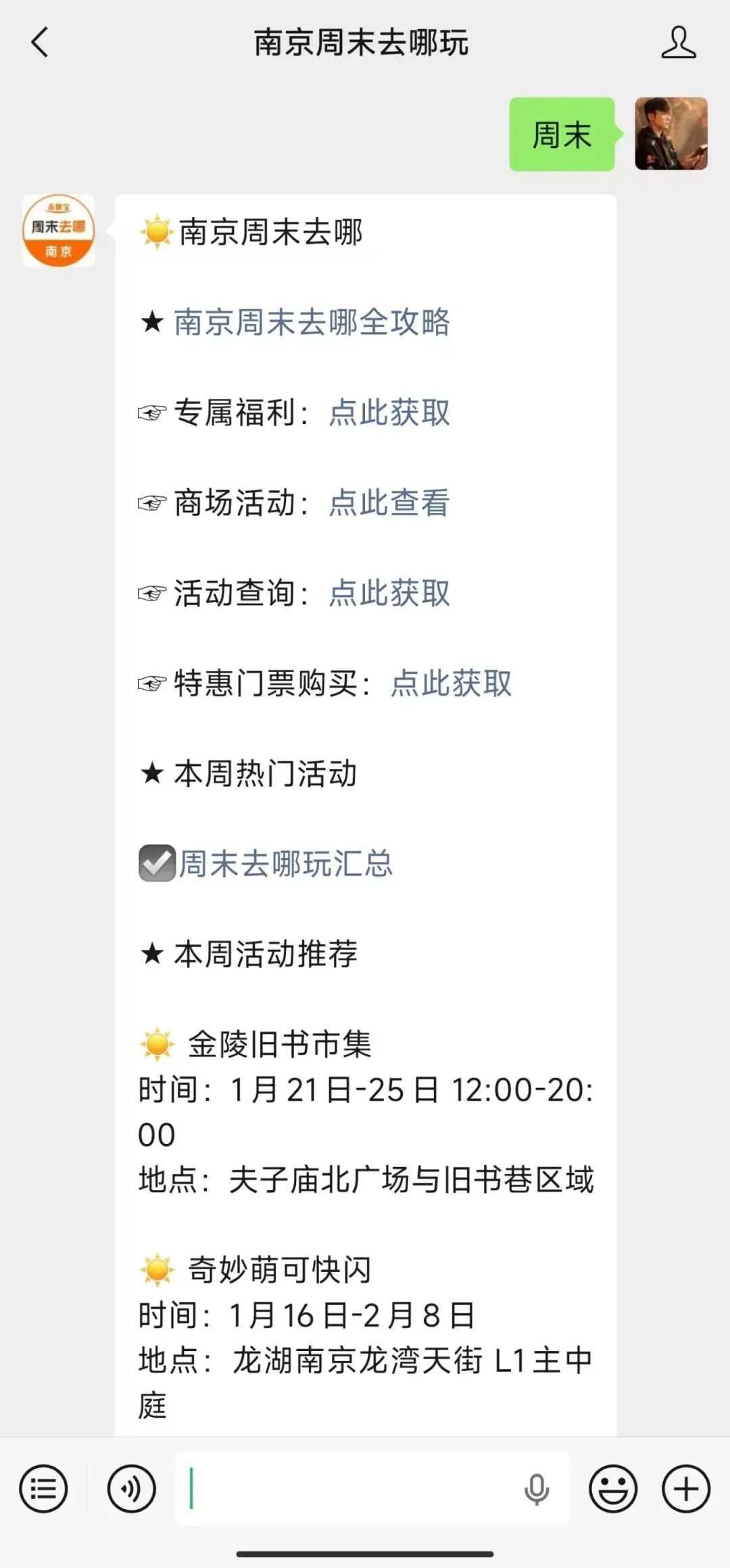 小编提醒:扫描下方二维码,关注【南京周末去哪玩】公众号,点击发消息,后台回复【周末】即可获取南京周末去哪全攻略、专属福利领取入口、商场活动、特惠门票购买等信息。