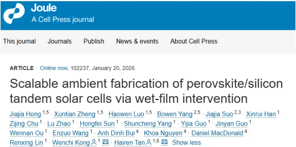 Jiajia Hong et.al Scalable ambient fabrication of perovskite/silicon tandem solar cells via wet-film intervention Joule 2026