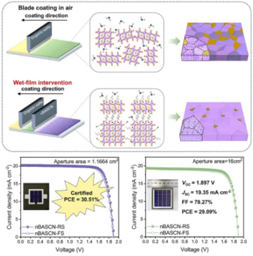 在环境条件下可扩展制造宽带隙钙钛矿子电池对于商业钙钛矿/硅串联光伏至关重要。然而,不受控制的环境湿度使结晶变得难以控制,并引发不可逆的表面分解。为了解决这一问题,南京大学谭海仁、Kong Wenchi报道了一种湿膜干预策略,使用双官能硫氰酸正丁基铵(nBASCN)来调节钙钛矿结晶并减轻水分的不利影响。