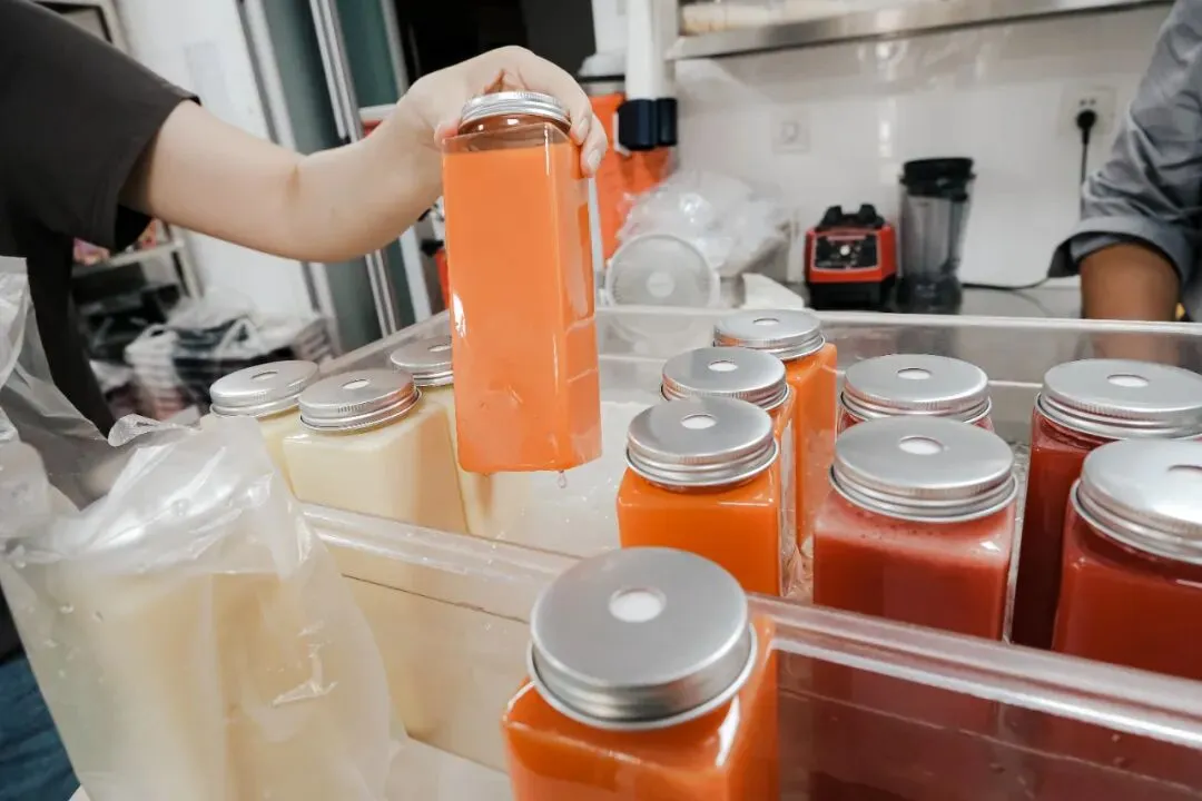 对外开放的职工风味餐厅内,有鲜榨的胡萝卜汁、西瓜汁,量大又好喝。