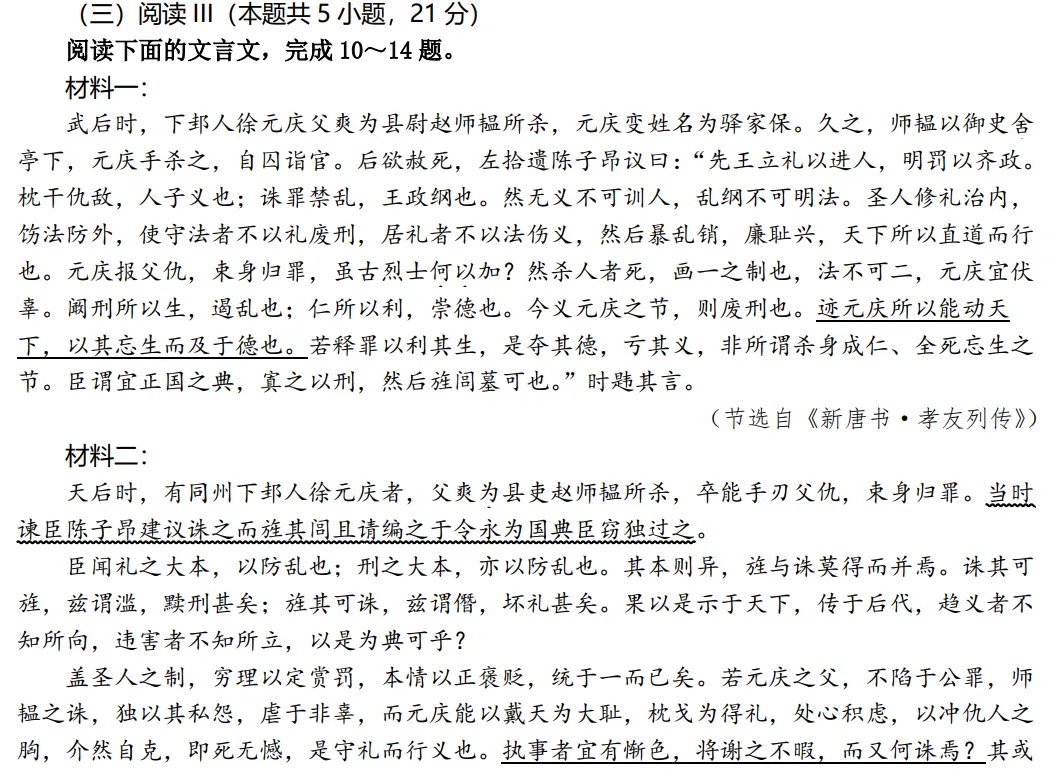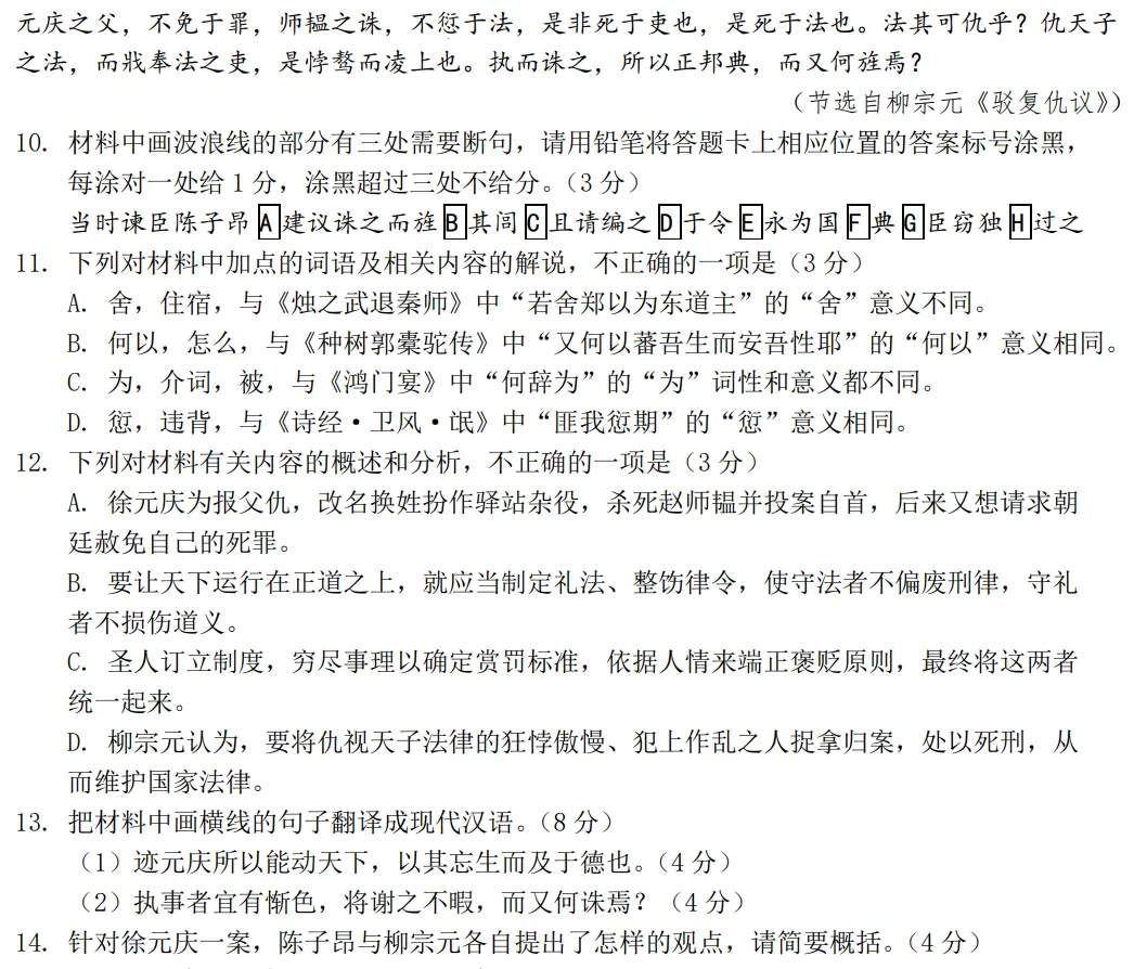 14.①陈子昂认为应按国法判处徐元庆死刑,同时在乡里表彰其孝行。②柳宗元认为如果其父有罪,就应将徐元庆诛杀;如果其父无罪被杀,应不杀徐元庆并表彰他的孝行。(共4分。每点2分)