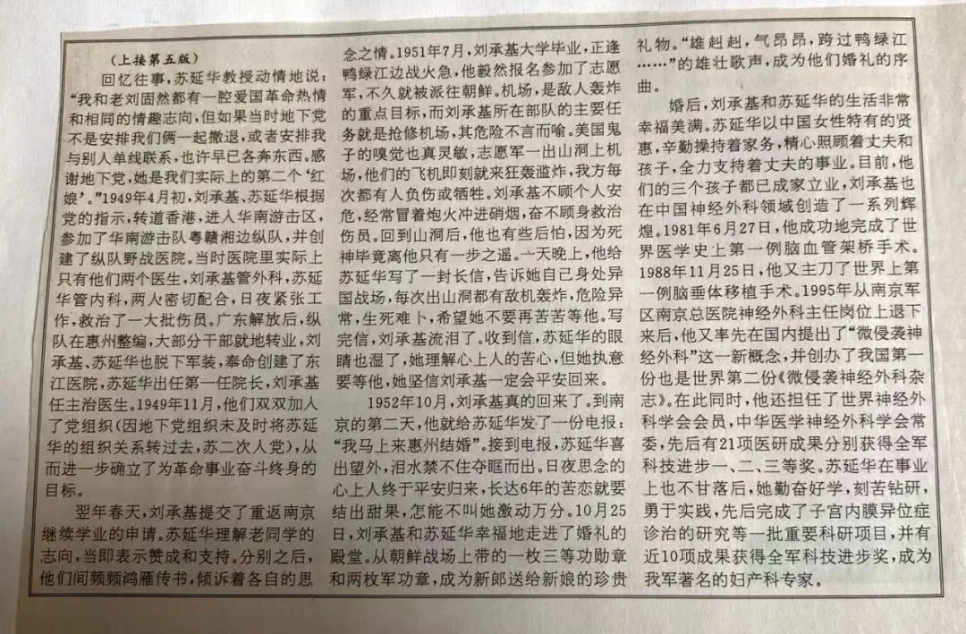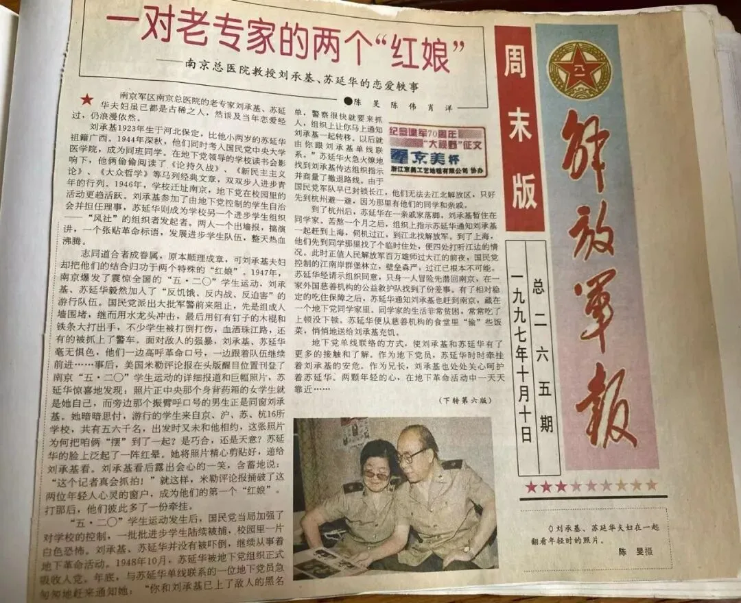 南京军区南京总医院的老专家刘承基,苏延华夫妇虽已都是古稀之人,然谈及当年恋爱经过,仍浪漫依然。刘承基1923年生于河北保定,比他小两岁的苏延华祖籍广西。1944年深秋,他们同时考入国民党中央大学医学院,成为同班同学。在地下党领导的学校读书会影响下,他俩偷偷阅读了《论持久战》、《新民主主义论》、《大众哲学》等马列经典文章,双双步入进步青年的行列。1946年,学校迁址南京,地下党在校园里的活动更趋活跃。刘承基参加了由地下党控制的学生自治会并担任理事,苏延华则成为学校另一个进步学生组织——"风社"的组织者发起者。两人一个出墙报,搞演讲,一个张贴革命标语,发展进步学生队伍,整天热血沸腾。志同道合者成眷属,原本顺理成章,可刘承基夫妇却把他们的结合归功于两个特殊的"红娘"。1947年,南京爆发了震惊全国的“五▪二0”学生运动,刘承基、苏延华毅然加入了“反饥饿、反内战、反迫害”的游行队伍。国民党派出大批军警前来阻止,先是组成人墙围堵,继而用水龙头冲击,最后用钉有钉子的木棍和铁条大打出手,不少学生被打倒打伤,血洒珠江路,还有的被抓上了警车。面对敌人的强暴,刘承基、苏延华毫无惧色,他们一边高呼革命口号,一边跟着队伍继续前进……事后,美国米勒评论报在头版醒目位置刊登了南京“五▪二0”学生运动的详细报道和巨幅照片,苏延华惊喜地发现:照片正中央那个身背药箱的女学生就是她自己,而旁边那个振臂呼口号的男生正是同窗刘承基。她暗暗思忖,游行的学生来自京、沪、苏、杭16所学校,共有五六千名,出发时又未和他相约,这张照片为何把咱俩“摆”到了一起?是巧合,还是天意?苏延华的脸上泛起了一阵红晕。她将照片精心剪贴好,递给刘承基看。刘承基看后露出会心的一笑,含蓄地说:“这个记者真会抓拍!”就这样,米勒评论报捅破了这两位年轻人心灵的窗户,成为他们的第一个“红娘”。打那后,他们彼此多了一份牵挂。“五▪二0”学生运动发生后,国民党当局加强了对学校的控制,一批批进步学生陆续被捕,校园里一片白色恐怖。刘承基、苏延华并没有被吓倒,继续从事着地下革命活动。1948年10月,苏延华被地下党组织正式吸收人党,年底,与苏延华单线联系的一位地下党员急匆匆地赶来通知她:“你和刘承基已上了敌人的黑名单,警察很快就要来抓人,组织上让你马上通知刘承基一起转移。以后就由你跟刘承基单线联系。”苏延华火急火燎地找到刘承基传达组织指示,并商量了撤退路线。由于国民党军队早已封锁长江,他们无法去江北解放区,只好先到杭州避一避,因为那里有他们的同学和亲戚。到了杭州后,苏延华在一亲戚家落脚,刘承基暂住在同学家。苦熬一个月之后,组织上指示苏延华通知刘承基一起赶到上海,伺机过江,到江北找解放军。到了上海,他们先到同学那里找了个临时住处,便四处打听江边的情况。此时正值人民解放军百万雄师过大江的前夜,国民党控制的江南岸群堡林立,壁垒森严,过江已根本不可能。苏延华经请示组织同意,只身一人冒险先潜回南京,在一家外国慈善机构的公益救护队找到了份差事。有了相对稳定的吃住保障之后,苏延华通知刘承基也赶到南京,藏在一个地下党同学家里。同学家的生活非常贫困,常常吃了上顿没下顿。苏延华便从慈善机构的食堂里“偷"些饭菜,悄悄地送给刘承基充饥。地下党单线联络的方式,使刘承基和苏延华有了更多的接触和了解。作为地下党员,苏延华时时牵挂着刘承基的安危。作为兄长,刘承基也处处关心呵护着苏延华。两颗年轻的心,在地下革命活动中一天天靠近……回忆往事,苏延华教授动情地说:“我和老刘固然都有一腔爱国革命热情和相同的情趣志向,但如果当时地下党不是安排我们俩一起撤退,或者安排我与别人单线联系,也许早已各奔东西。感谢地下党,她是我们实际上的第二个‘红娘’。”1949年4月初,刘承基、苏延华根据党的指示,转道香港,进入华南游击区,参加了华南游击队粤赣湘边纵队,并创建了纵队野战医院。当时医院里实际上只有他们两个医生,刘承基管外科,苏延华管内科,两人密切配合,日夜紧张工作,救治了一大批伤员。广东解放后,纵队在惠州整编,大部分干部就地转业,刘承基、苏延华也脱下军装,奉命创建了东江医院,苏延华出任第一任院长,刘承基任主治医生。1949年11月,他们双双加入了党组织(因地下党组织未及时将苏延华的组织关系转过去,苏二次入党),从而进一步确立了为革命事业奋斗终身的目标。翌年春天,刘承基提交了重返南京继续学业的申请。苏延华理解老同学的志向,当即表示赞成和支持。分别之后,他们间频频鸿雁传书,倾诉着各自的思念之情。1951年7月,刘承基大学毕业,正逢鸭绿江边战火急,他毅然报名参加了志愿军,不久就被派往朝鲜。机场,是敌人轰炸的重点目标,而刘承基所在部队的主要任务就是抢修机场,其危险不言而喻。美国鬼子的嗅觉也真灵敏,志愿军一出山洞上机场,他们的飞机即刻就来狂轰滥炸,我方每次都有人负伤或牺牲。刘承基不顾个人安危,经常冒着炮火冲进硝烟,奋不顾身救治伤员。回到山洞后,他也有些后怕,因为死神毕竟离他只有一步之遥。一天晚上,他给苏延华写了一封长信,告诉她自己身处异国战场,每次出山洞都有敌机轰炸,危险异常,生死难卜,希望她不要再苦苦等