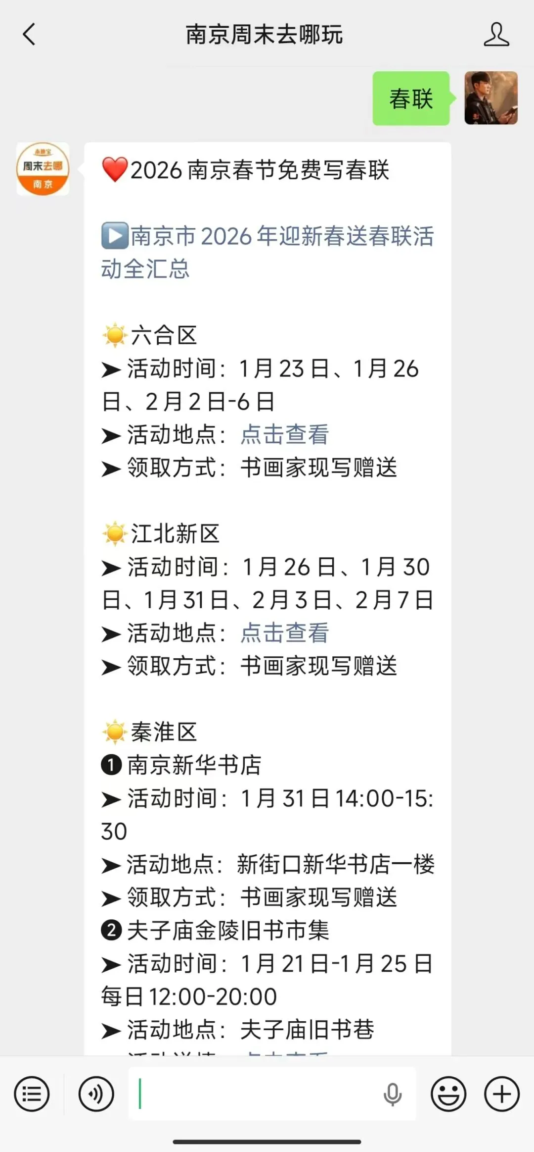 小编提醒:扫描下方二维码,关注【南京周末去哪玩】公众号,私信回复【春联】即可获取南京免费领春联活动、领春联活动报名入口、领取时间、地点等(小编会持续更新更多免费领春联、写春联活动)
