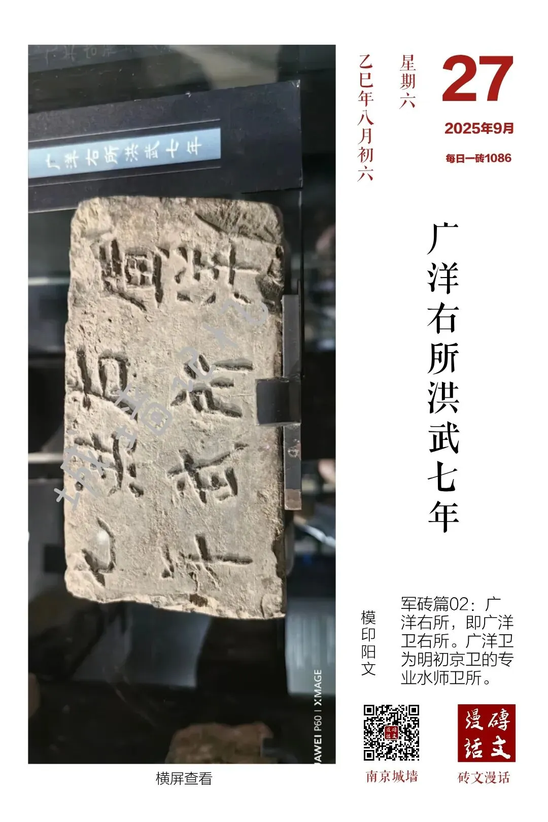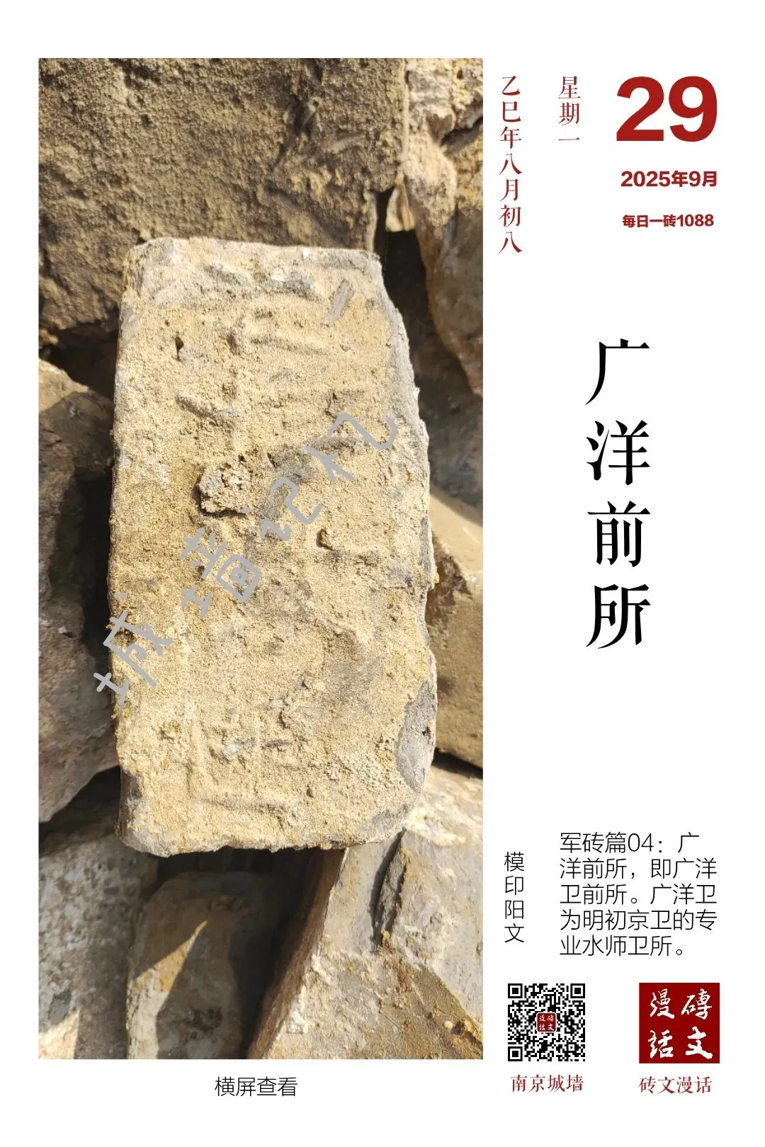 右卫后所、水军前卫左所、水军前卫右所、广洋中所、广洋右所 洪武七年、广洋前所、广洋后所 洪武七年造、江阴卫右、江阴后卫、横海卫、横海前所、邵所、朱所、中所、正前癸巳军砖、正前任、黑左军、前所张林造、甲防、左胡玄佑、右胡正右袁、海捕八所、海定罗号。