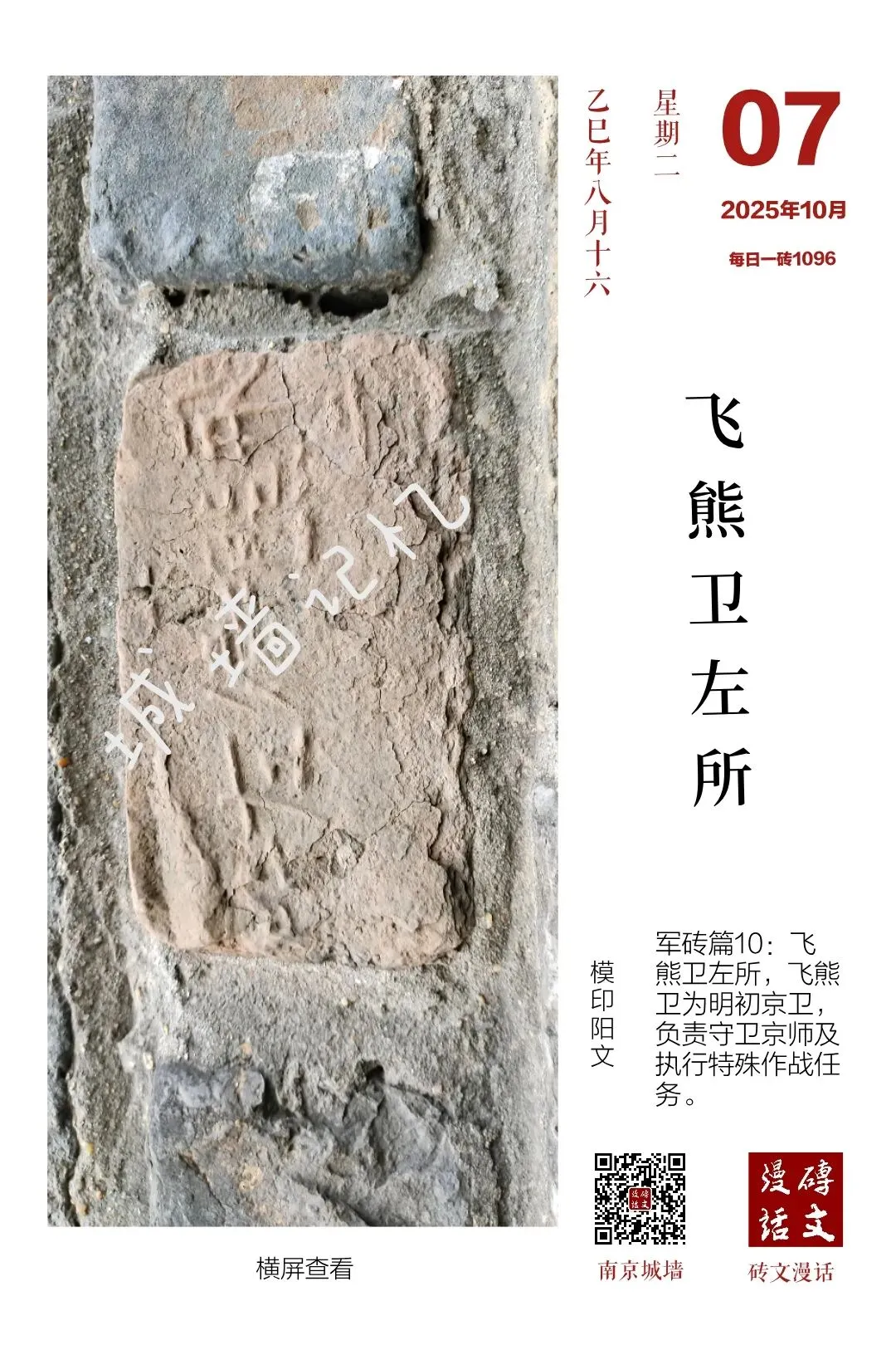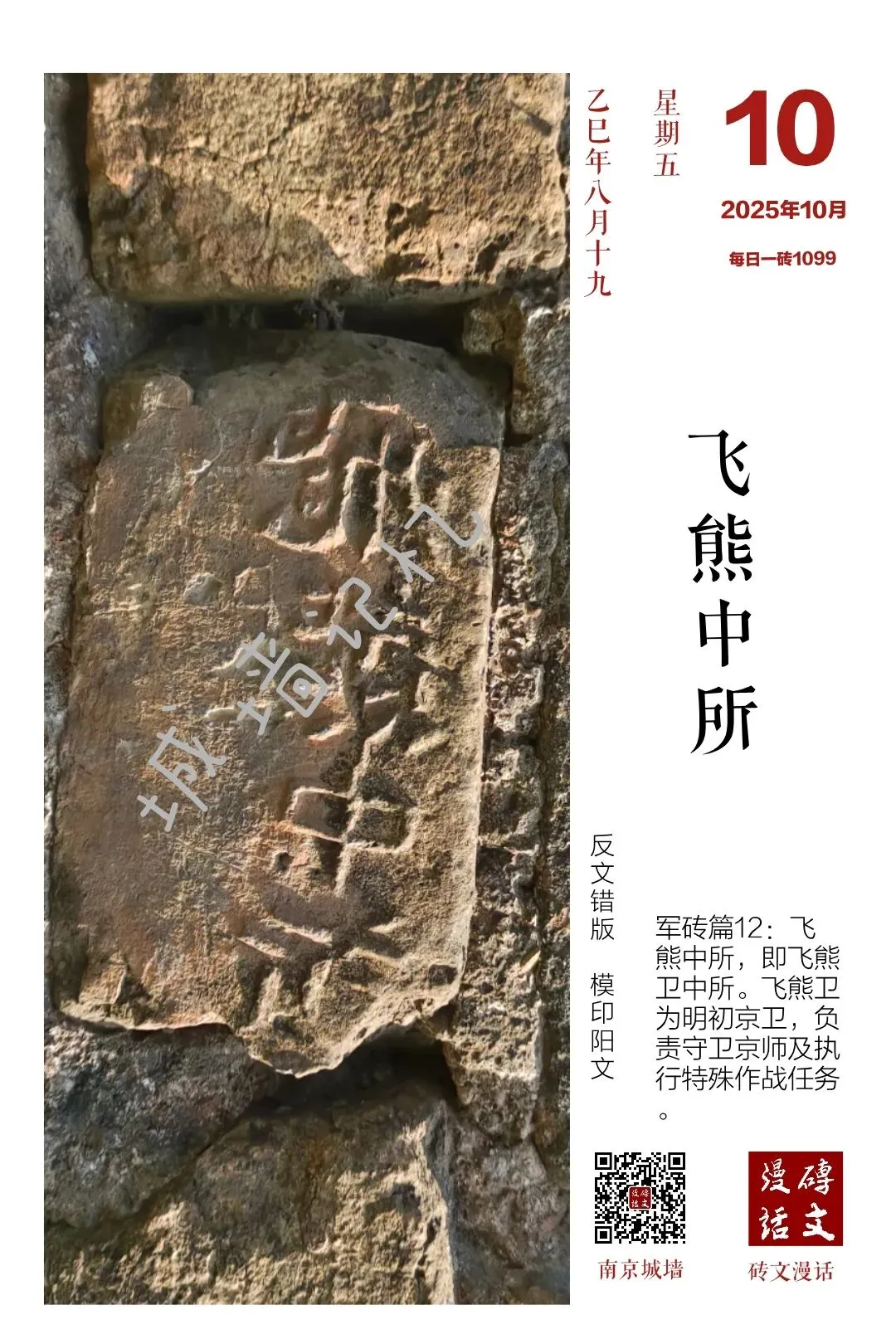 注1:《南京城墙志》、《南京城墙砖文》、《铭文天下》均收录有飞熊卫左、右、中、前、后5所。其中《南京城墙志》所载"飞前远、飞前叶、飞前扬、飞中六”为不同铭文内容的飞前卫前所、中所砖。