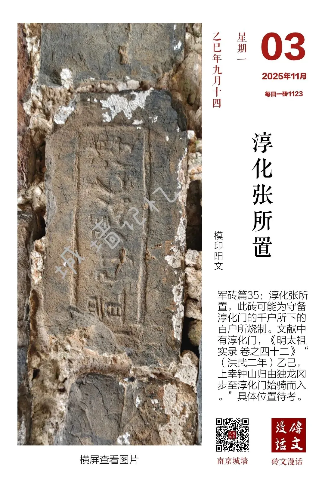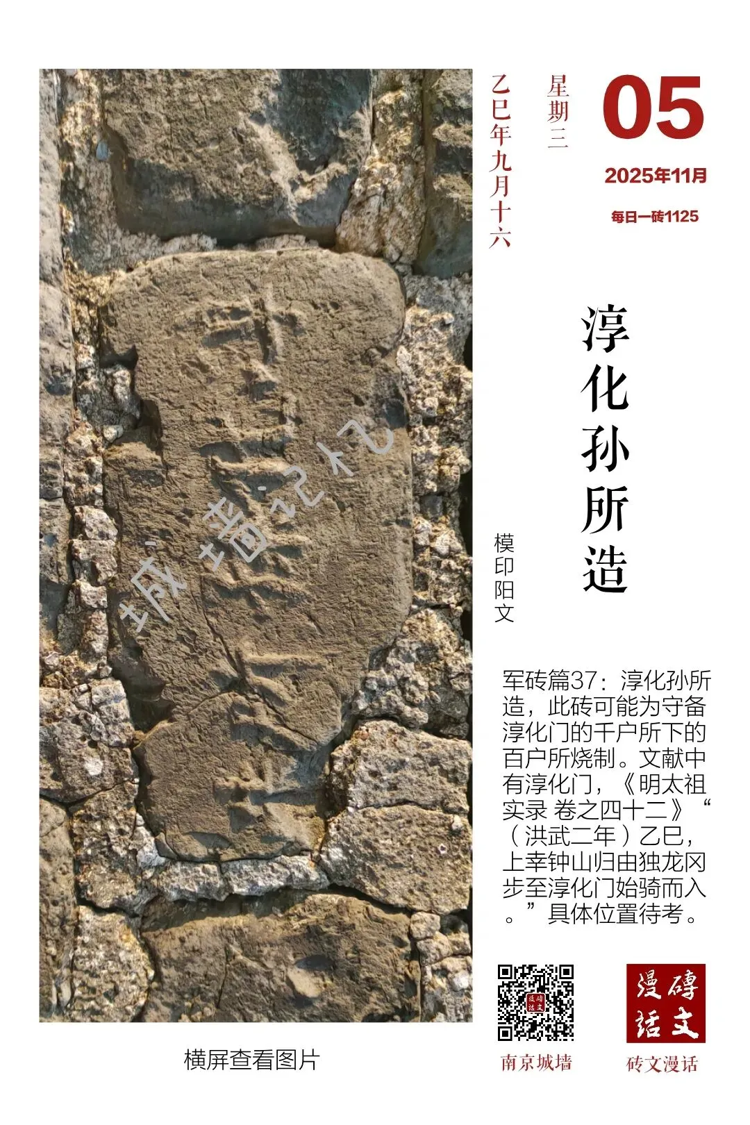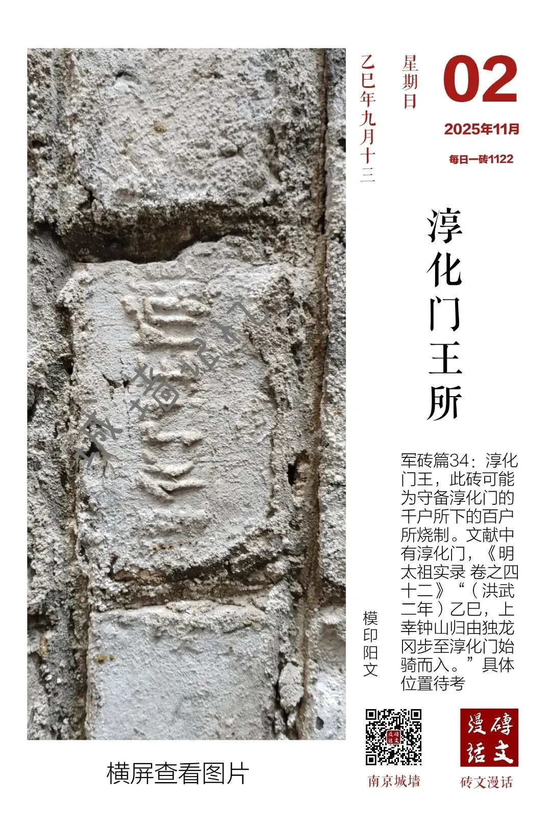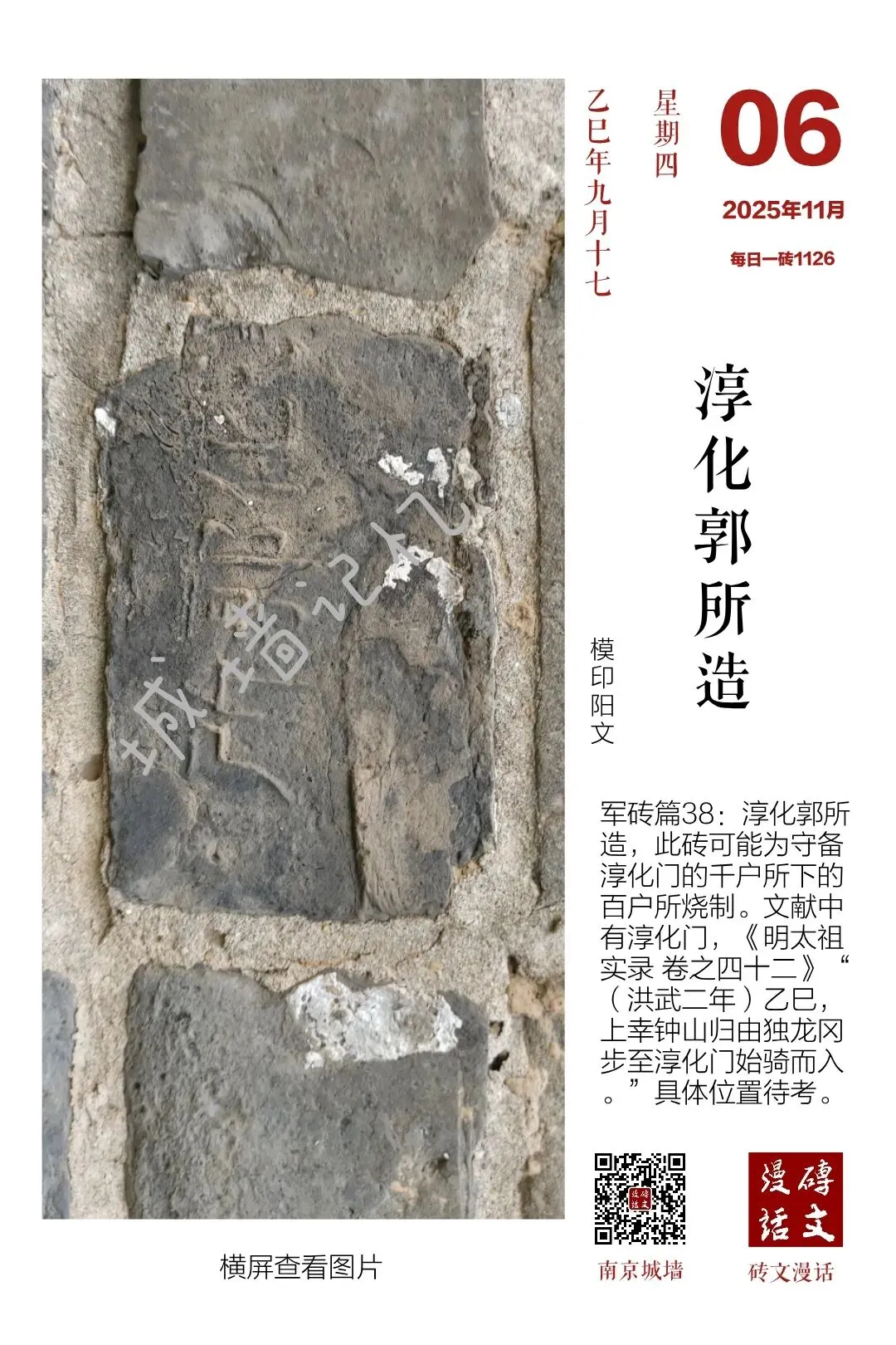 注1:目前采集的淳化门砖铭文多为有“淳化”或“淳化门”,南京城墙博物馆藏有一块“淳字六号”砖,在南京城墙上暂未发现“淳字”砖。
