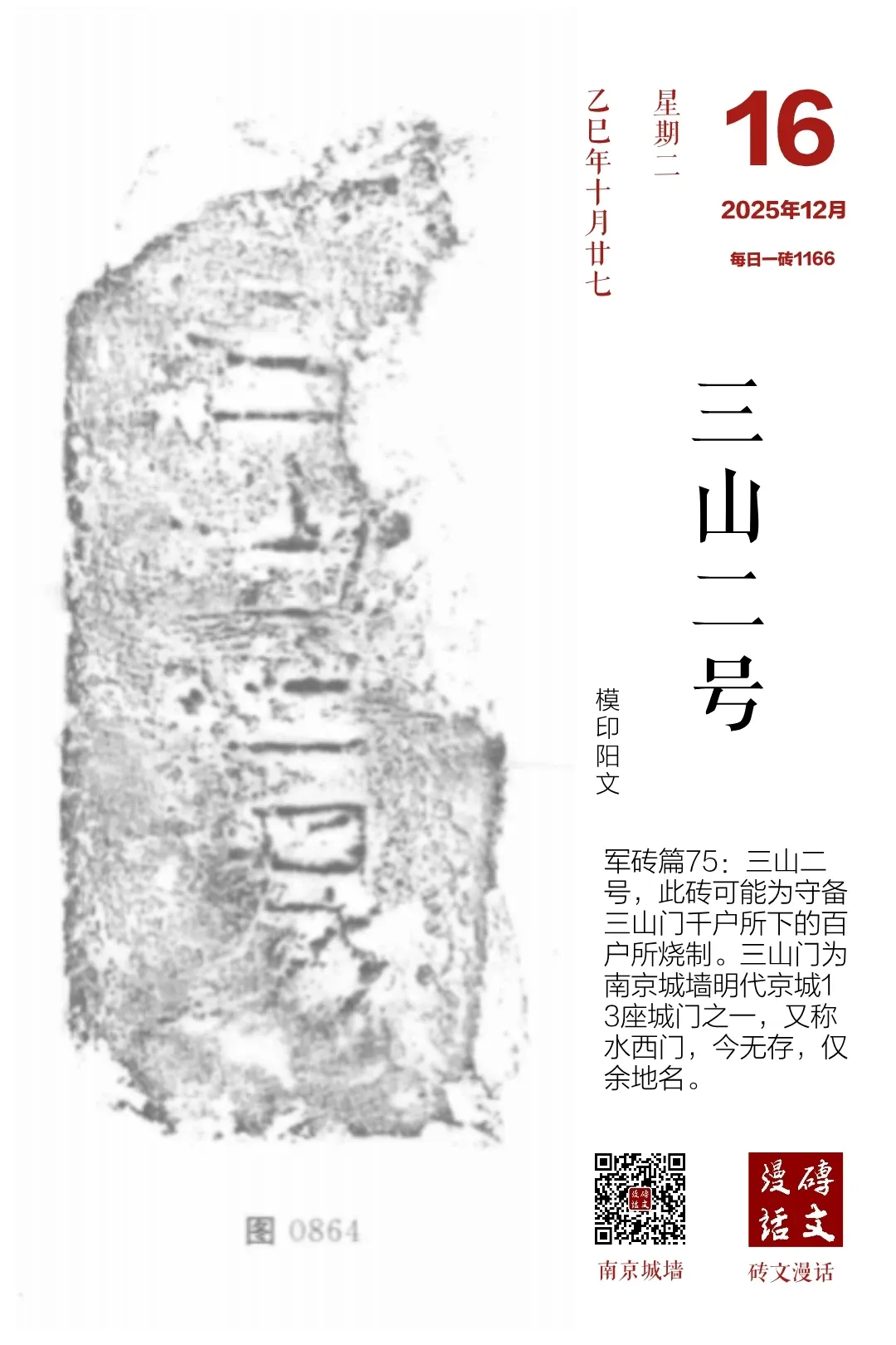 注2:南京城墙博物馆藏有一块“山”字砖,铭文中第三个字笔画不完整,完整铭文可能为“山字弍”,《南京城墙志》收录有“山字弍号”。“山字弍”“山字弍号”与“三山二号”统计为同一单位。
