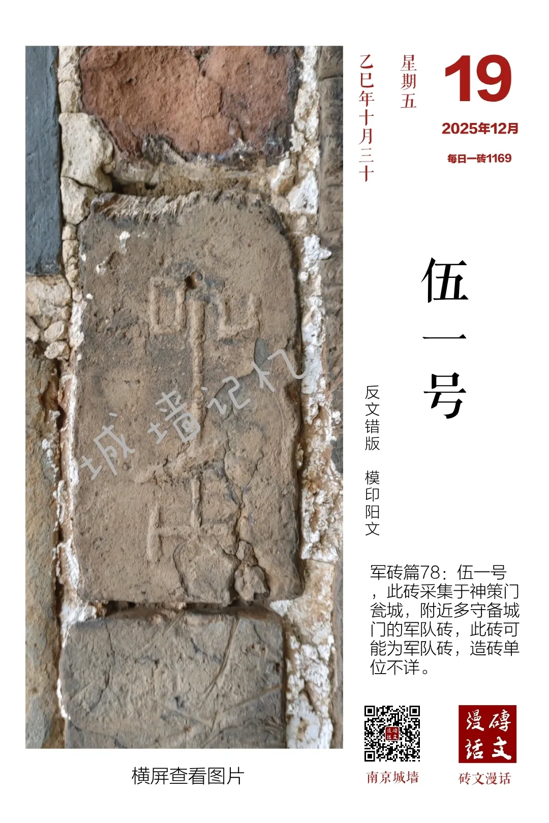 注:“伍一号”铭文砖采集于神策门瓮城,因附近发现较多军队砖,从城砖尺寸和铭文样式,推测此砖可能也是军队砖,具体单位不详。