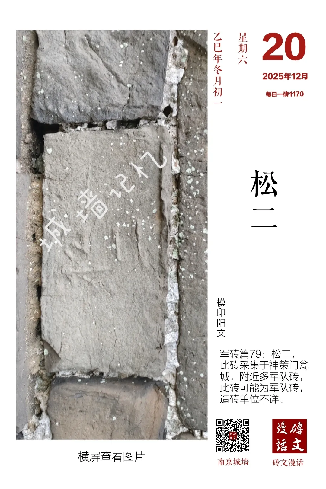 注:在神策门瓮城采集到多块“松二”铭文砖,因附近发现较多军队砖,从城砖尺寸和铭文样式,推测此砖可能也是军队砖,具体单位不详。