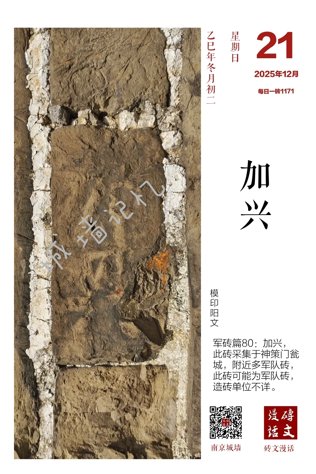 注:在神策门瓮城采集到多块“加兴”铭文砖,因附近发现较多军队砖,从城砖尺寸和铭文样式,推测此砖可能也是军队砖,具体单位不详。