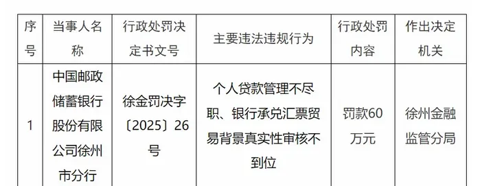 近日,徐州两家银行,因为“项目贷款管理不尽职、个人贷款贷后管理不审慎的主要违法违规行为”、“个人贷款管理不尽职、银行承兑汇票贸易背景真实性审核不到位”,被罚款60万元。