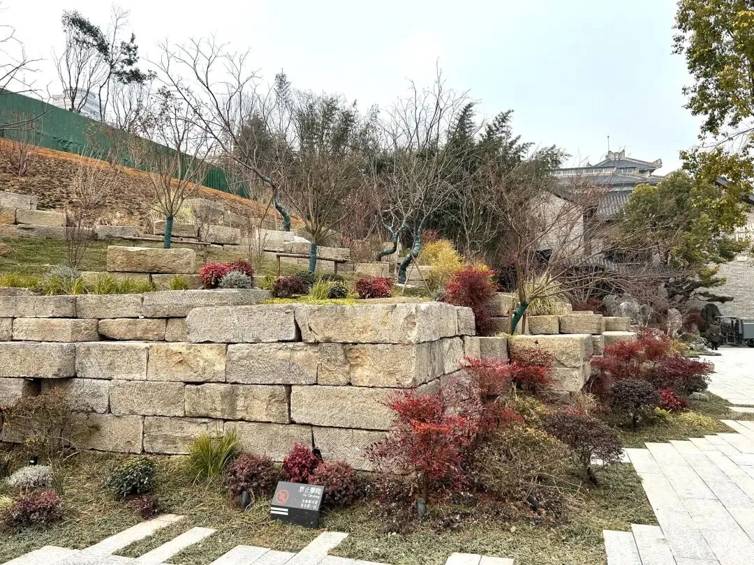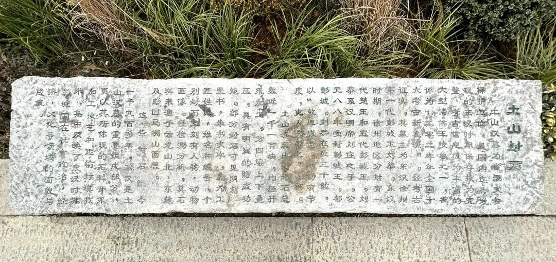 土山二号墓考古项目负责人耿建军介绍,土山实际上是土山汉墓的封土。封土清理后,墓室上方至封土之间铺设的4层封石显露出来,南北共16排,每排用石约17块,总数近1100块。封石大小不一,大部分边长约0.93米、厚约0.35米,最长的边长可达1.7米。封石具有明显的防盗功能,部分石面可见阴刻垩书或朱书文字,应为工匠姓氏、姓名或编号,个别封石上还刻有人物、动物画像。平铺在封石前草坪的“土山封石”碑文显示:“土山汉墓为省级文物保护单位,是国内迄今发现的东汉时期保存较为完整、考古信息极为丰富的大型诸侯王陵墓之一”“经考古证实,其墓主为东汉徐州第一代彭城王刘恭。”
