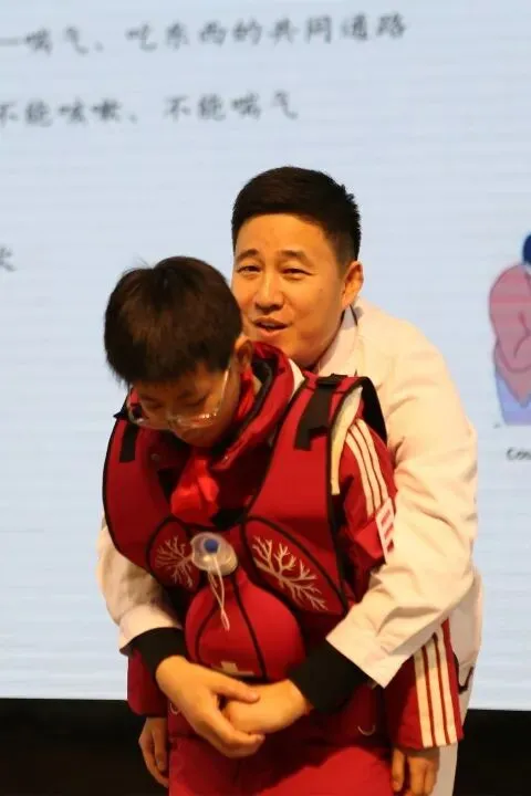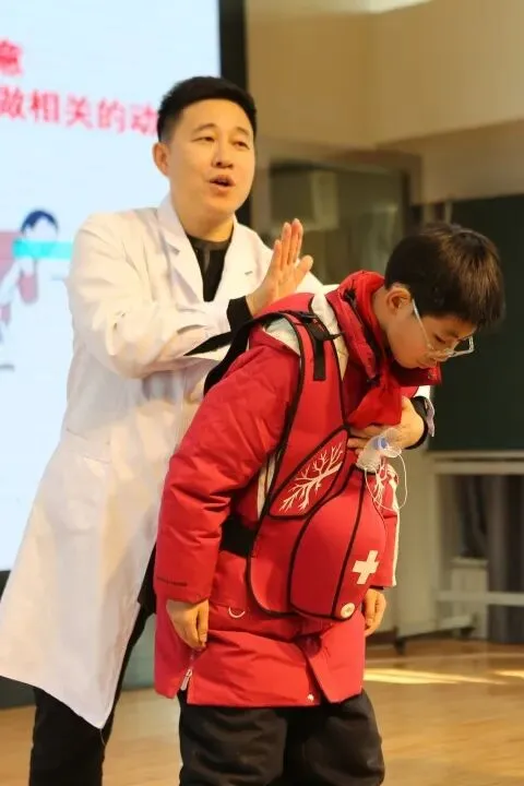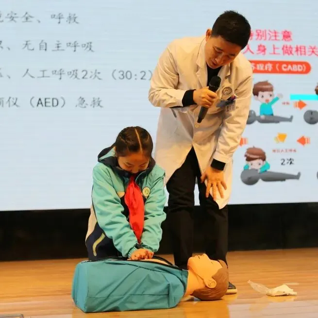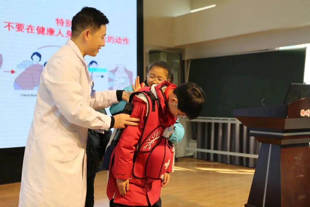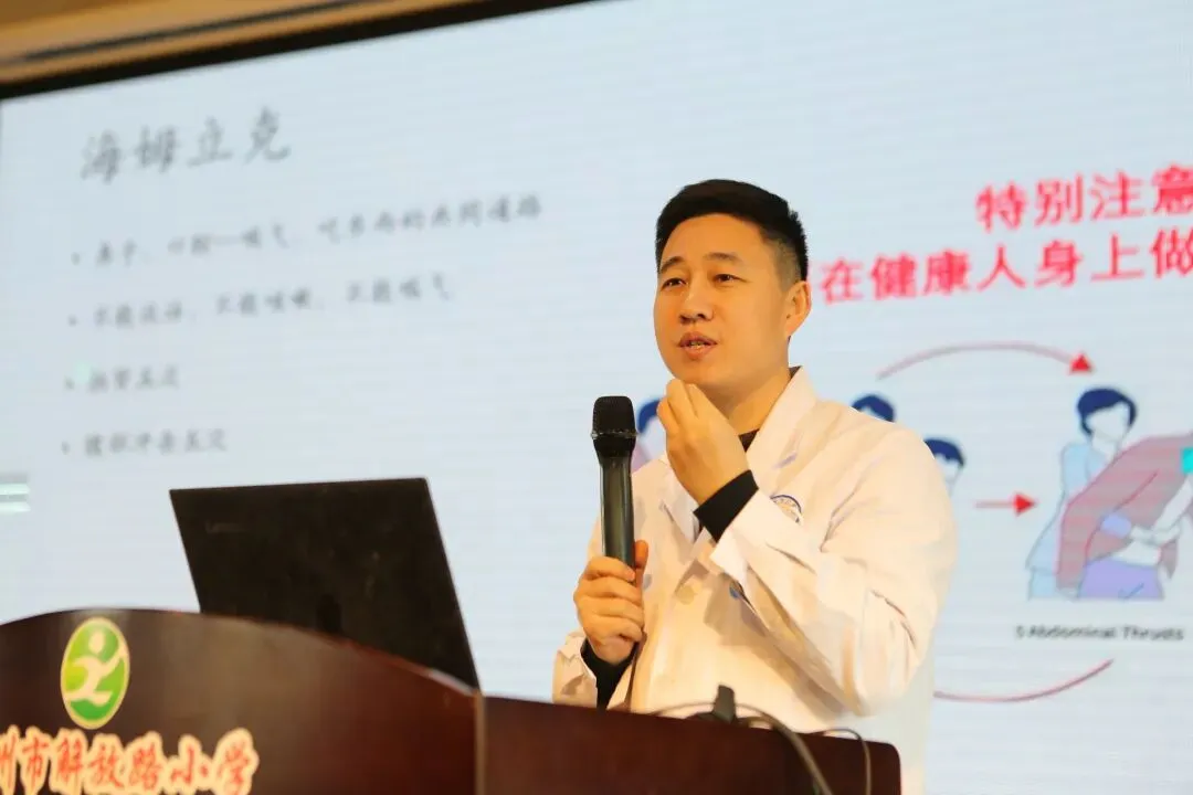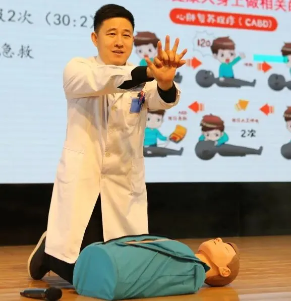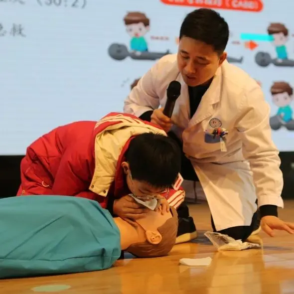 活动现场,陈震主任聚焦校园常见意外场景,深入浅出地讲解了海姆立克急救法、心肺复苏(CPR)、流鼻血正确处置、烧烫伤“冲脱泡盖送”五步骤、鱼刺卡喉科学应对等实用知识。针对海姆立克急救法中“不能说话、不能咳嗽、不能喘气”的紧急判断标准,以及“拍背五次、腹部冲击五次”的操作要领,陈主任亲自示范动作细节,手把手指导学生实操;心肺复苏教学中,从环境安全判断、意识呼吸检查,到“30:2”的按压与人工呼吸比例,再到自动体外除颤仪(AED)的使用要点,每一个关键环节都讲解得细致入微,助力师生快速掌握核心技能。