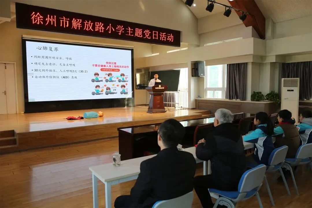 一直以来,徐州市解放路小学党支部始终将生命安全与健康教育作为党建引领校园发展的重要内容,把应急救护普及纳入校园安全工作重点。党支部定期通过主题党日、专题讲座、健康课堂、实战演练等形式,让心肺复苏、应急救护常识走进日常教学。以“勤学、常练、实用”为原则,让学生在反复实践中熟练掌握急救技能,逐步提升自救互救能力,同时引导党团员教师发挥先锋模范作用,传递安全守护正能量。