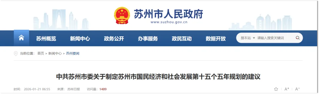 1月21日,《中共苏州市委关于制定苏州市国民经济和社会发展第十五个五年规划的建议》全文公布。《建议》明确提出,打造低空经济发展高地。深度融入长三角大飞机产业集群建设。开展新技术新产品新场景大规模应用示范行动,加快新兴产业规模化发展,争创国家新兴产业发展示范基地。加强关键核心技术攻关,在集成电路、工业母机、基础软件、具身智能、低空经济等领域部署实施一批重大科技任务。加快建设现代化基础设施体系,统筹推进传统基础设施更新和新型基础设施建设,适度超前谋划实施一批战略性、跨区域、带动强的重大基础设施项目。推进通用机场、低空基础设施建设,推动苏州民用运输机场研究论证。依法管控无人驾驶航空器,建强专业处置力量,提升监管和反制能力。《建议》部分内容分享如下。