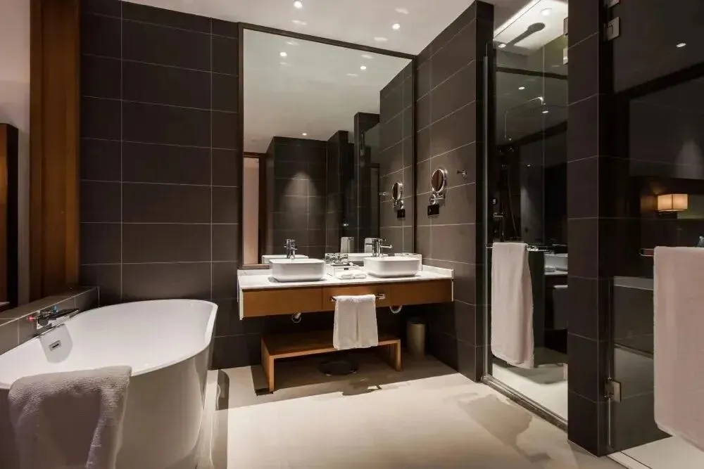 干湿分离卫浴间,双台盆设计,使入住者享受到更好地酒店体验。在豪华的浴缸里,完全慵懒放松的身体,这是酒店能给到的高级体验。