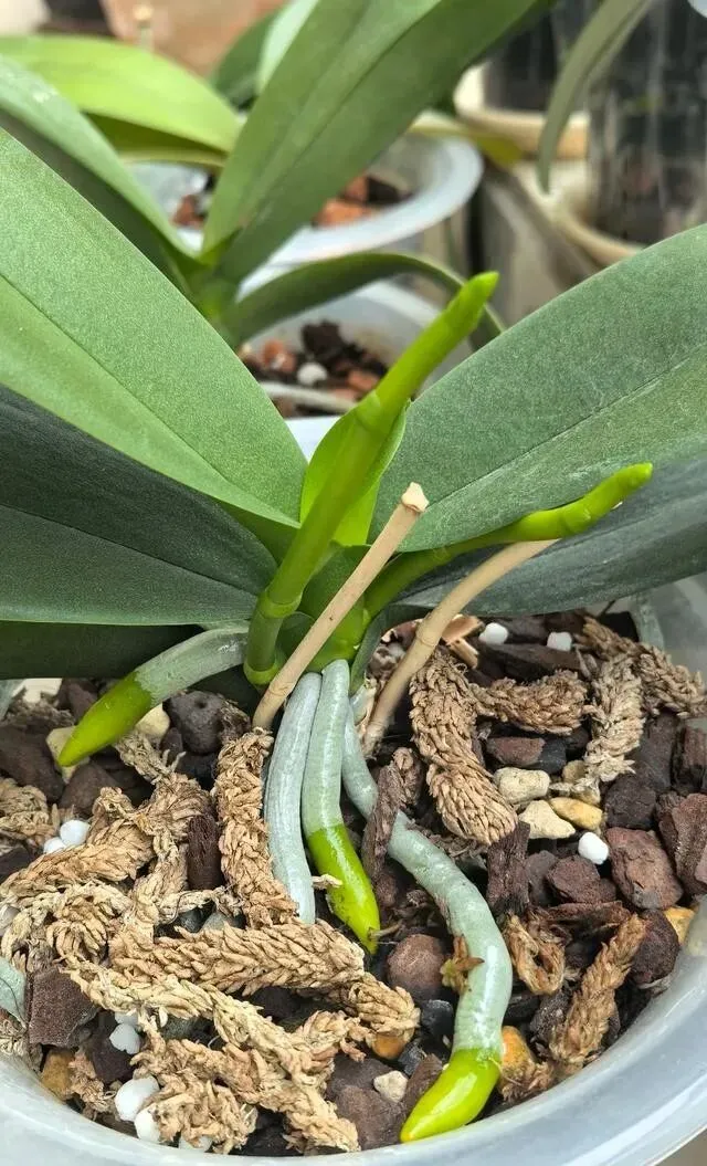 把旧水苔全部扒掉 , 仔细看看根 , 烂的全剪掉 , 叶子有病斑也摘掉。
