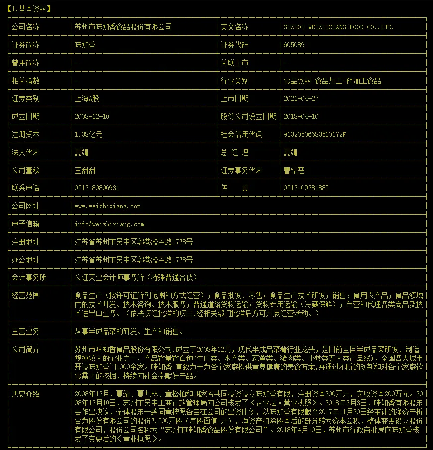 一头连着田间地头,一头连着千家万户的餐桌,预制菜是推进一二三产业融合发展、满足消费升级、关系居民饮食健康的重要产业。当前,我国预制菜产业已步入从规模扩张向价值提升的关键转型期,在多方面展现出鲜明的特点,预制菜产业呈现由量转质的变革,相关企业更聚焦于提升产品品质、优化产品结构,以实现高质量发展。 从消费需求端来看,预制菜市场“餐饮专业化”和“家庭品质化”双线并行。在餐饮消费中,预制菜的口味稳定性和出餐高效性在当下的经济环境中受到餐饮商家的青睐,预制菜的优势全方位满足了餐饮商家降本增效、构筑标准化的迫切需求。从家庭及个人消费者来看,在快节奏生活与消费观念升级的影响下,家庭及个人消费者对预制菜的需求正发生显著转变,从过去便捷性的考量逐渐走向多元化和品质化的追求,同时情感价值也成为了新的增长点,“悦己”消费也逐渐让预制菜成为年轻人的选择。 从企业层面来看,传统食品企业通过横纵向整合、技术赋能、资源优化等举措,深耕预制菜产业发展。预制菜行业正逐步摆脱初期的无序与过热,走向更为理性、成熟的发展轨道。随着国家政策的持续引导与规范,食品安全与标准化问题将逐步得到解决。在技术创新的驱动下,预制菜生产将更加高效、智能,从原料采购到终端销售的全产业链追溯体系也将愈发完善。而企业将更加注重品质与口碑,通过精准的市场定位和优质的产品服务,增强消费者的认同感与忠诚度。可以预见,未来预制菜行业将在各个维度不断优化升级,以更优质的产品、更完善的服务,满足消费者多元化的饮食需求,实现产业的可持续、高质量发展 。 (二)公司主要业务 公司主要从事半成品菜的研发、生产和销售,始终坚持以“只甄选优质好食材”为理念,致力于为各个家庭提供营养健康的美食方案,成为一家“美好生活方式提供商”。自成立以来,公司主营业务未发生重大变化。 公司目前已建立了“味知香”、“馔玉”两大核心品牌,“味爱疯狂”、“搜香”等重要品牌。公司产品种类丰富,建立了 6 大产品系列,为不同的消费者提供健康、绿色、方便、美味的菜肴。各位粉丝朋友大家好,为避免文章被和谐,故文章所写内容均为公开的数据,没有写具体的策略和方法,请大家见谅。具体的方法策略大家可以加微脉圈粉丝群进行交流沟通。水平有限,不足之处大家多多评论区留言,本文章内容仅供大家作为参考,不做推荐,恳请大家多多分享,如果觉得文章对你有所帮助的,别忘了点文末的喜欢作者哦,你的赞赏是我的动力哦