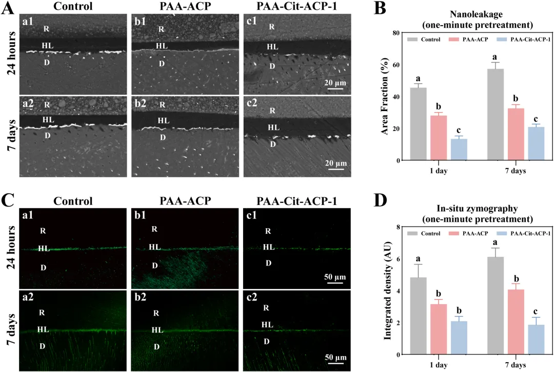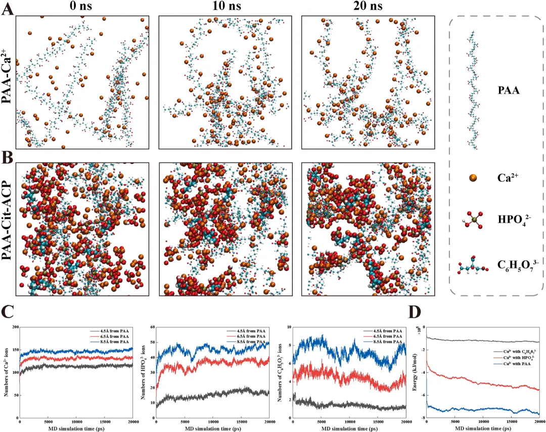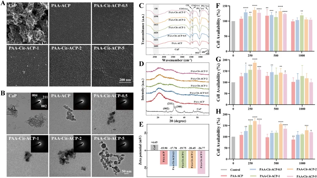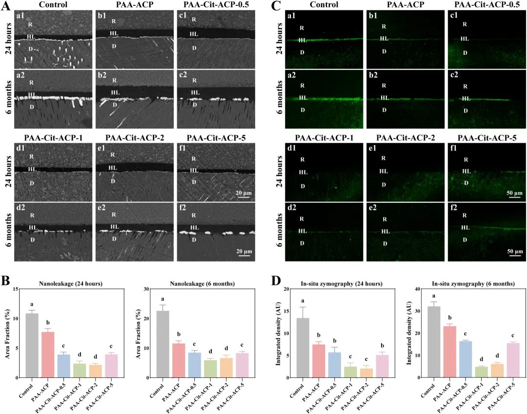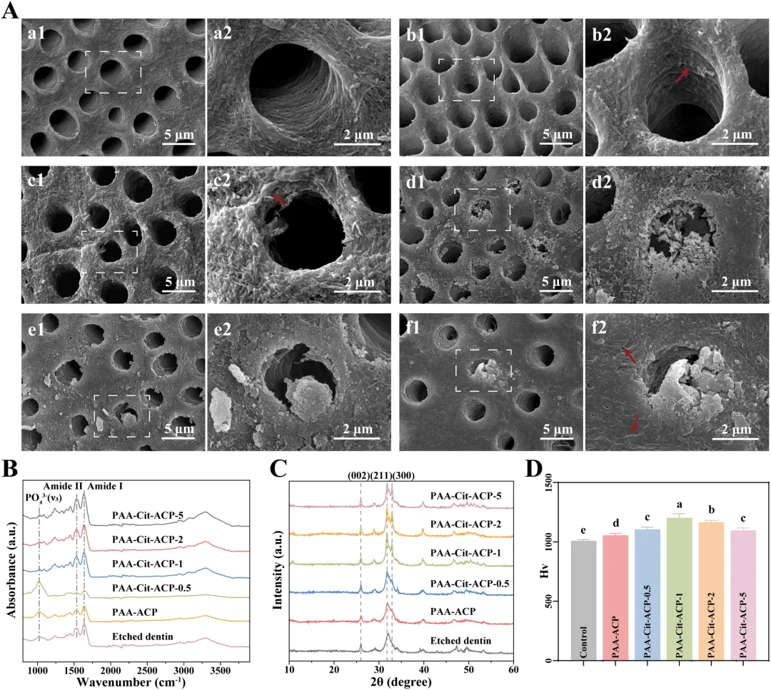 研究导读:本文由南京医科大学附属口腔医院牙髓病科于《Dental Materials》(IF:6.3)上发表,研究结果表明,PAA-Cit-ACP可促进快速仿生再矿化,保护暴露的脱矿胶原纤维免受水和基质金属蛋白酶(MMPs)诱导的降解,并提高混合层的稳定性。图1:PAA-Cit-ACP的表征。(A) CaP、PAA-ACP、PAA-Cit-ACP的代表性SEM图像。(B) CaP、 PAAACP 、PAA-Cit-ACP的代表性TEM和 SAED 图像。(C) CaP、PAA-ACP、PAA-Cit-ACP的傅里叶变换红外(FTIR)光谱。(D) CaP、PAA-ACP、PAA-Cit-ACP的X射线衍射(XRD)光谱。(E) CaP、PAA-ACP、PAA-Cit-ACP的Zeta电位。(F-H)PAA-ACP和PAA-Cit-ACP在1天(F)、4天(G)和7天(H)的 CCK -8结果。图2:分子动力学模拟。(A)PAA吸收钙离子20ns后的模拟快照。(B)向PAA- Ca² ⁺体系中加入 HPO₄² ⁻离子和 C₆H₅O₇³ ⁻离子后形成的PAA-Cit-ACP模拟快照(t=20ns)。(C) Ca² ⁺离子、 HPO₄² ⁻离子和 C₆H₅O₇³ ⁻离子在距离PAA4.5A、6.5A和8.5A处的浓度变化(t=20ns)。(D) Ca² ⁺离子与PAA、 Ca² ⁺离子与 HPO₄² ⁻离子、 Ca² ⁺离子与 C₆H₅O₇³ ⁻离子之间的静电相互作用。图3:胶原纤维矿化。(A)胶原纤维矿化12小时后的代表性透射电镜(TEM)和扫描电子显微镜(SAED)图像。处理组从左至右依次为PAA-ACP、PAA-Cit-ACP-0.5、PAA-Cit-ACP-1、PAA-Cit-ACP-2和PAA-Cit-ACP-5。(B)经PAA-ACP、PAA-Cit-ACP-0.5、PAA-Cit-ACP-1、PAA-Cit-ACP-2和PAA-Cit-ACP-5处理的胶原纤维的扫描透射电子显微镜(STEM)和能谱分析(EDS)映射图像。图4:胶原纤维分别矿化24小时和7天。(A)胶原纤维矿化24小时的代表性透射电镜(TEM)和 SAED 图像。处理组从左至右依次为PAA-ACP、PAA-Cit-ACP-0.5、PAA-Cit-ACP-1、PAA-Cit-ACP-2和PAA-Cit-ACP-5。(B)胶原纤维7天矿化后的代表性TEM和 SAED 图像。处理组从左至右依次为PAA-ACP、PAA-Cit-ACP-0.5、PAA-Cit-ACP-1、PAA-Cit-ACP-2和PAA-Cit-ACP-5。图5:牙本质矿化过程。(A)不同处理组牙本质的代表性扫描电镜图像。(a1,a2)未处理组,(b1,b2)PAA-ACP组,(c1,c2)PAA-Cit-ACP-0.5组,(d1,d2)PAA-Cit-ACP-1组,(e1,e2)PAA-Cit-ACP-2组,(f1,f2)PAA-Cit-ACP-5组。箭头所示为胶原纤维局部直径增大的区域。(B)傅里叶变换红外光谱(FTIR)。(C)X射线衍射光谱(XRD)。(D)维氏硬度测试(VHN)。图6:粘接面在七天矿化后的粘接性能。(A) 24小时储存后(a1-f1)与6个月储存后(a2-f2)的纳米渗漏代表性扫描电镜图像。(B) 纳米渗漏的定量计算结果。不同上标字母表示实验组间存在统计学显著差异(P < 0.05)。(C) 24小时储存后(a1-f1)与6个月储存后(a2-f2)的原位酶谱代表性 CLSM 图像。(D) 荧光强度的定量计算结果。不同上标字母表示实验组间存在统计学显著差异(P < 0.05)。R:树脂;D:牙本质;HL:混合层。图7:经一分钟预处理后粘接面的粘接性能。(A) 24小时储存(a1-c1)与7天储存(a2-c2)后的纳米渗漏代表性扫描电镜图像。(B) 纳米渗漏定量计算结果。不同上标字母表示实验组间存在统计学显著差异(P < 0.05)。(C) 24小时储存(a1-c1)与7天储存(a2-c2)后的原位酶谱代表性 CLSM 图像。(D) 荧光强度定量计算结果。基于本体外研究的局限性,可以得出结论:当柠檬酸盐与聚丙烯酸(PAA)结合时,能有效稳定过饱和磷酸钙溶液。这一过程会形成聚丙烯酸/柠檬酸盐/无定形磷酸钙复合物。这些复合物具有良好的生物相容性,并能在特定浓度下促进牙髓干细胞增殖。与PAA-ACP相比,PAA-Cit-ACP能更快、更完全地诱导重组I型胶原纤维的仿生矿化及部分脱矿牙本质的再矿化。由此形成的持久性混合层可能具有更强的抗蛋白水解降解能力。源于Yinying Chen的论文《Polyacrylic acid/citrate/amorphous calcium phosphate complex for dentin remineralization and bond durability》(2025年),因客观原因未能与权利人取得联系。本平台出于学术交流目的引用,无意侵犯原作者权益。如权利人认为不妥,请及时联系公众号后台,我们将立即删除或协商解决。医学国自然,省自然,博士课题设计,医学实验外包,医学SCI,实验方案设计,免费的线上博导一对一沟通,确认实力后再谈合作,科研合作可以加微信:SCI971SCI国家杰青一对一答疑视频