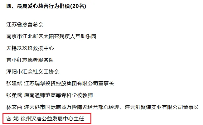 12月26日,省政府召开第七届“江苏慈善奖”表彰大会,作为江苏省公益慈善领域规格最高、影响最广的综合性荣誉,“江苏慈善奖”每两年评选一次。本届“江苏慈善奖”评选共设置最具爱心慈善捐赠企业或单位、最具爱心慈善捐赠个人、最具爱心慈善行为楷模、最具影响力慈善项目、最具影响力慈善组织、优秀慈善工作者6个奖项。徐州汉唐公益发展中心主任容妮荣获“江苏慈善奖”最具爱心慈善行为楷模称号。