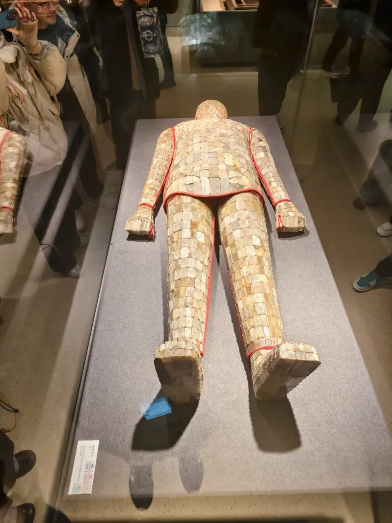 其中6件在历史馆展出,包括新石器时期的透雕人鸟兽玉饰、神人兽面纹玉琮,东汉的银缕玉衣、广陵王玺金印,西晋的青釉神兽尊,南朝的竹林七贤与荣启期模印砖画(195件禁止出国展览文物之一),这些我都见到了,3张还拍了照,但对比网友的图片效果,汗颜!
