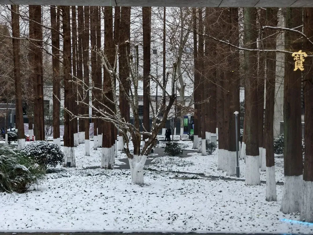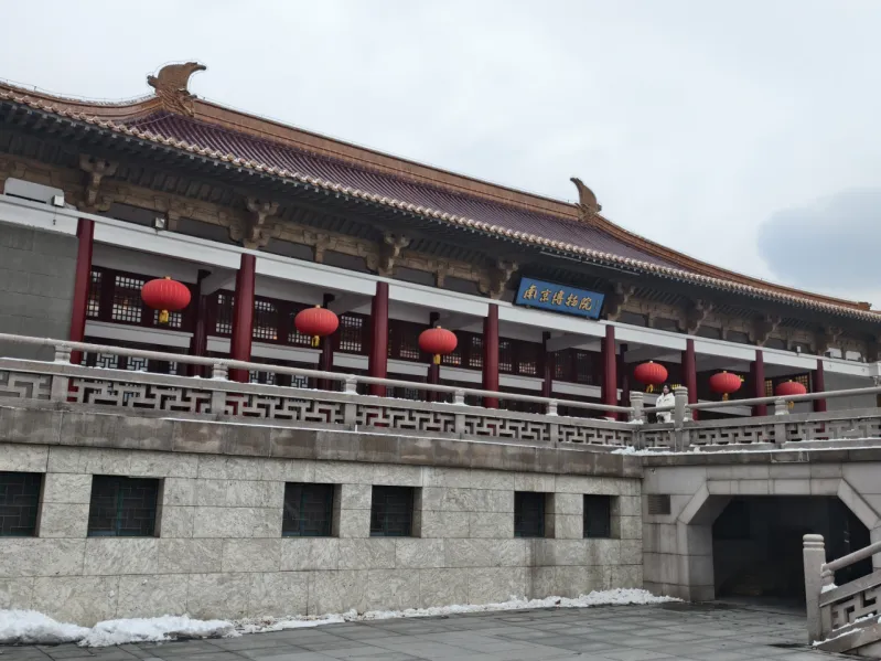 从位于一楼的6厅出来,由北向南出历史馆时,经过一段西侧是玻璃墙的长廊,透过玻璃望去,雪景之中的水杉挺拔,雪白与枯黄之中绿意生动,颇似一幅园林美景图。从一楼走出历史馆,近看这座仿辽代宫殿式的建筑,依然可感受其外形之美,可谓远观近赏总相宜!