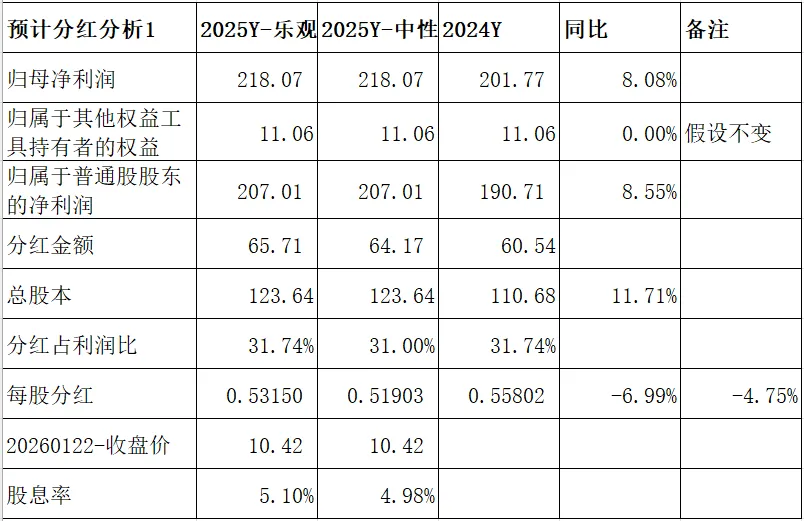 首先看中性预测,分红占利润比为31.00%,推算出来每股分红金额为0.51903元,同比下降6.99%,主要受可转债转股成功致使股本数增加影响导致。按2026年1月22日收盘价10.42元,计算出来股息率4.98%,明显高于银行一般理财收益率。