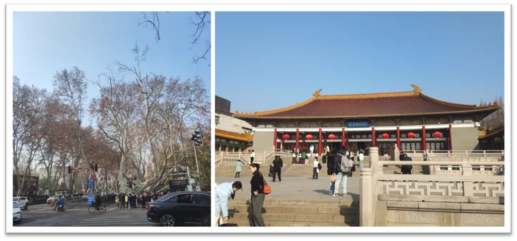 我们的第一站是南京博物院。刚出地铁站,就看到了南京航天航空大学,道路两侧有很多梧桐树,厚重的历史气息扑面而来。在路上,我们碰到了很多讲解员在推销自己。越靠近博物院人越多,因为时间紧迫,我们走马观花,基本把博物院逛完了。在参观的过程中,经常会看到四五个人扎堆,讲解员戴个口罩,拿着小型麦克风,其他人戴着耳麦在那津津有味地听着,旁边偶尔也有两三个人在那“蹭听”。